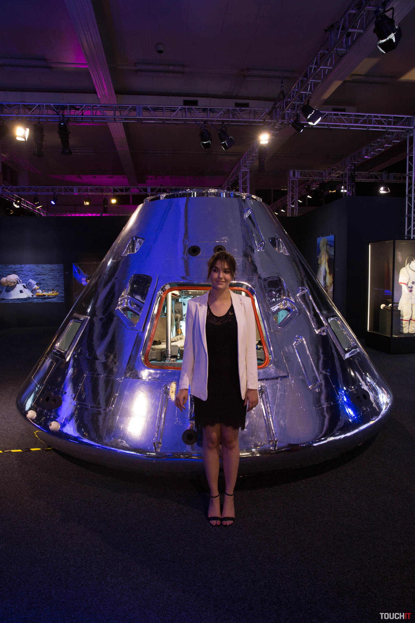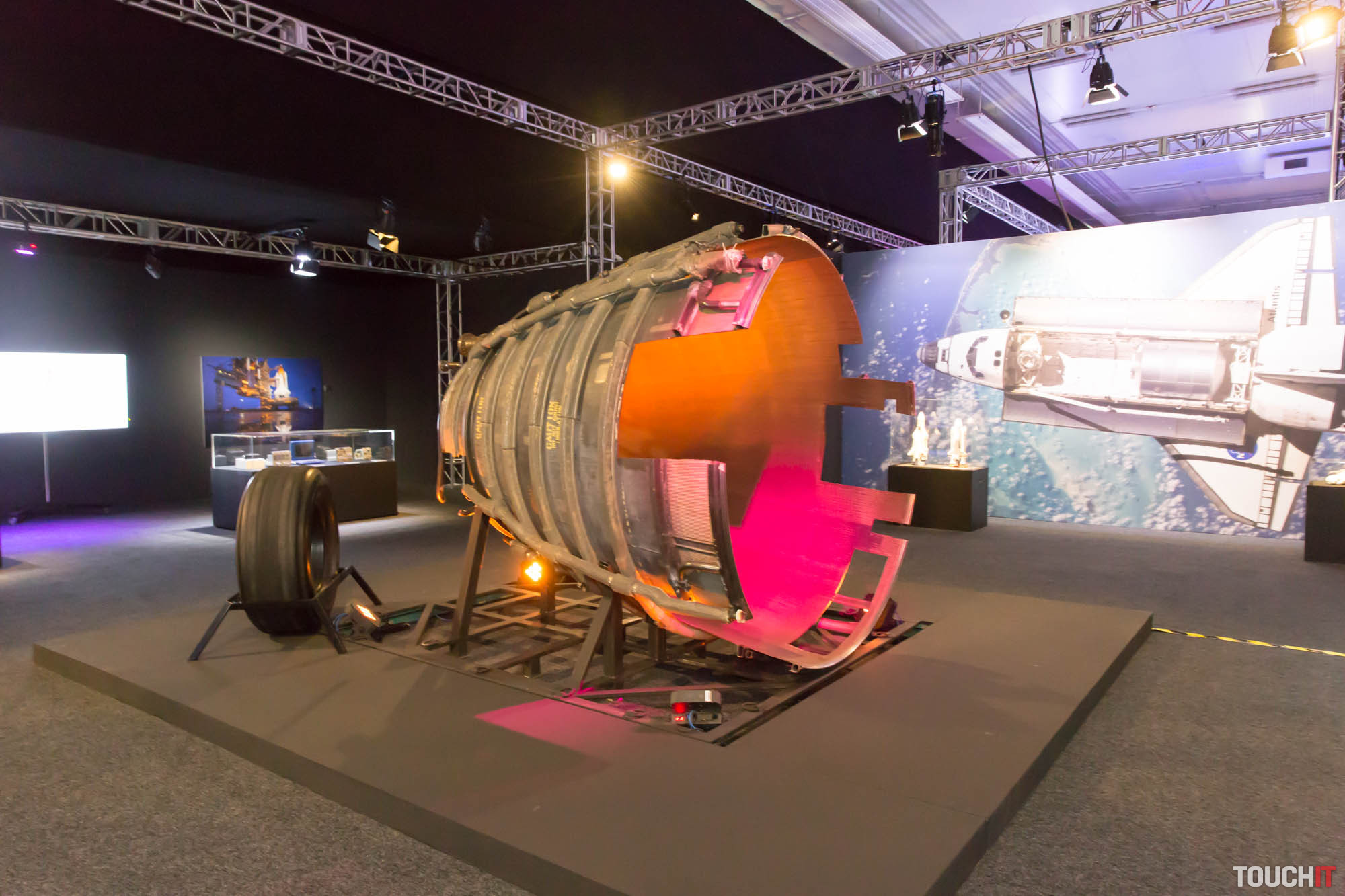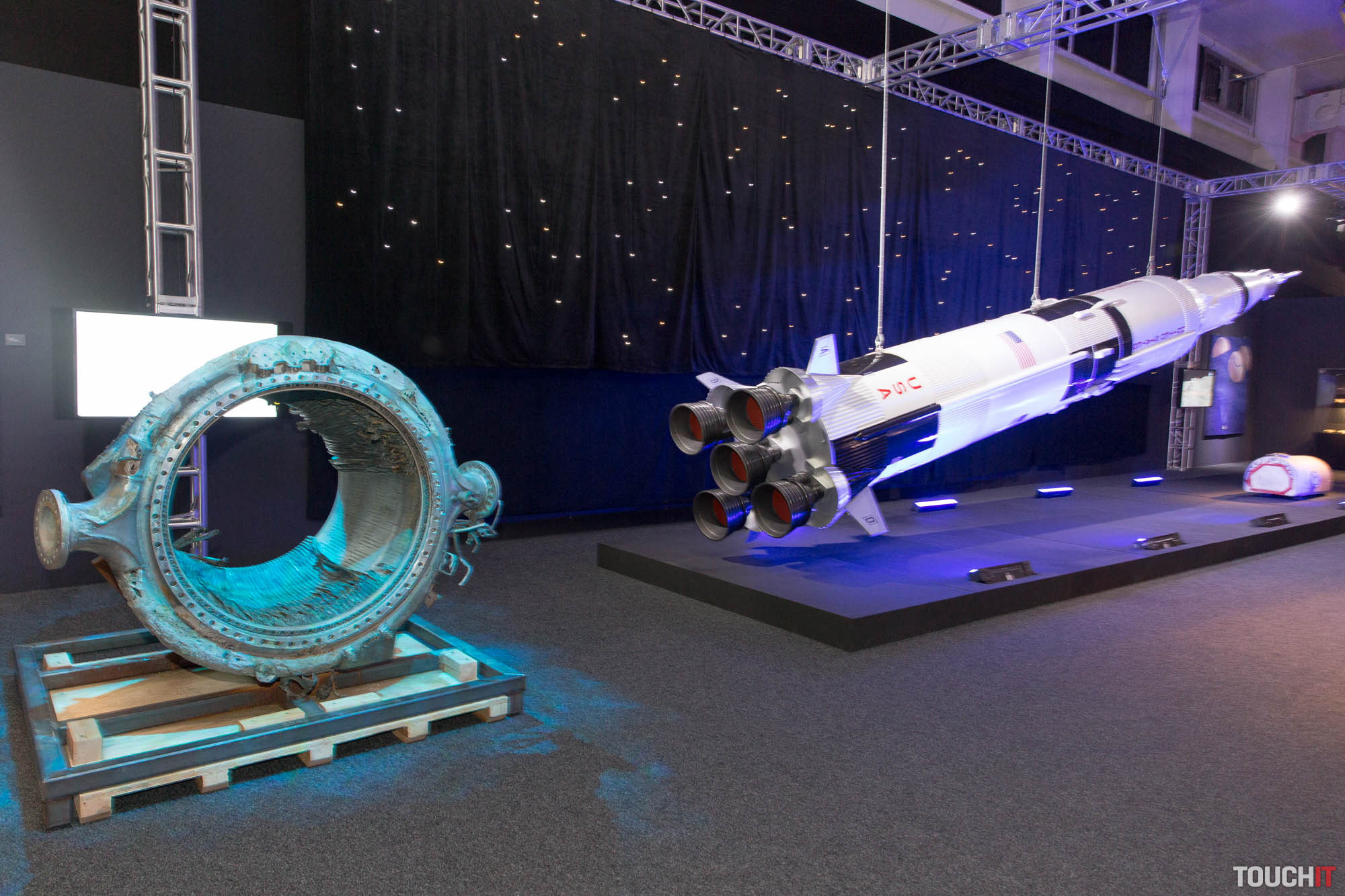 Asi najvzácnejší exponát výstavy – časť spaľovacieho motora, ktorý dopravil raketu na Mesiac. Tento stupeň sa pri lete rakety plánovane odpojil a dopadol do Atlantického oceána. Tu ostal veľa rokov a dnes je v Bratislave