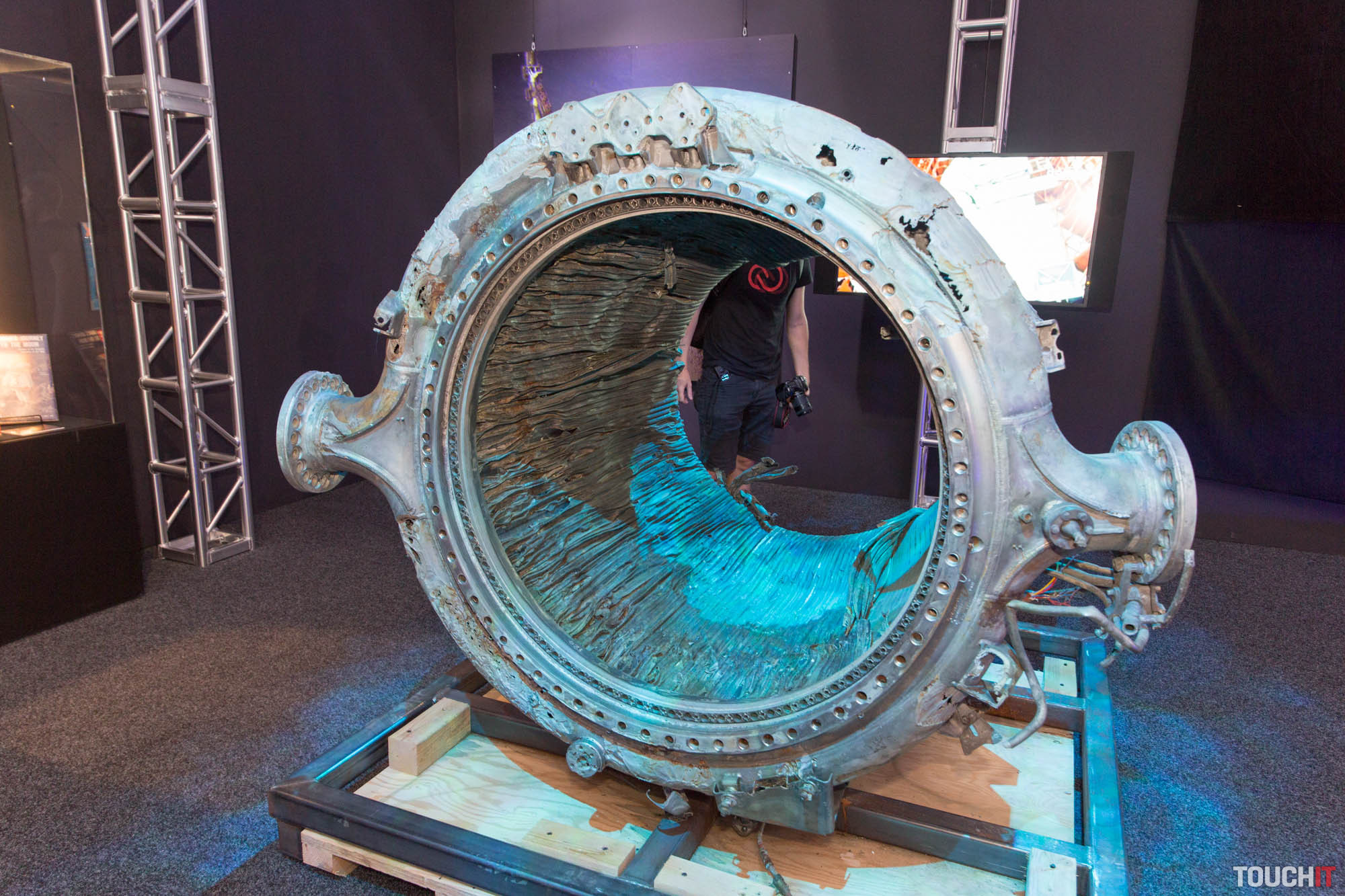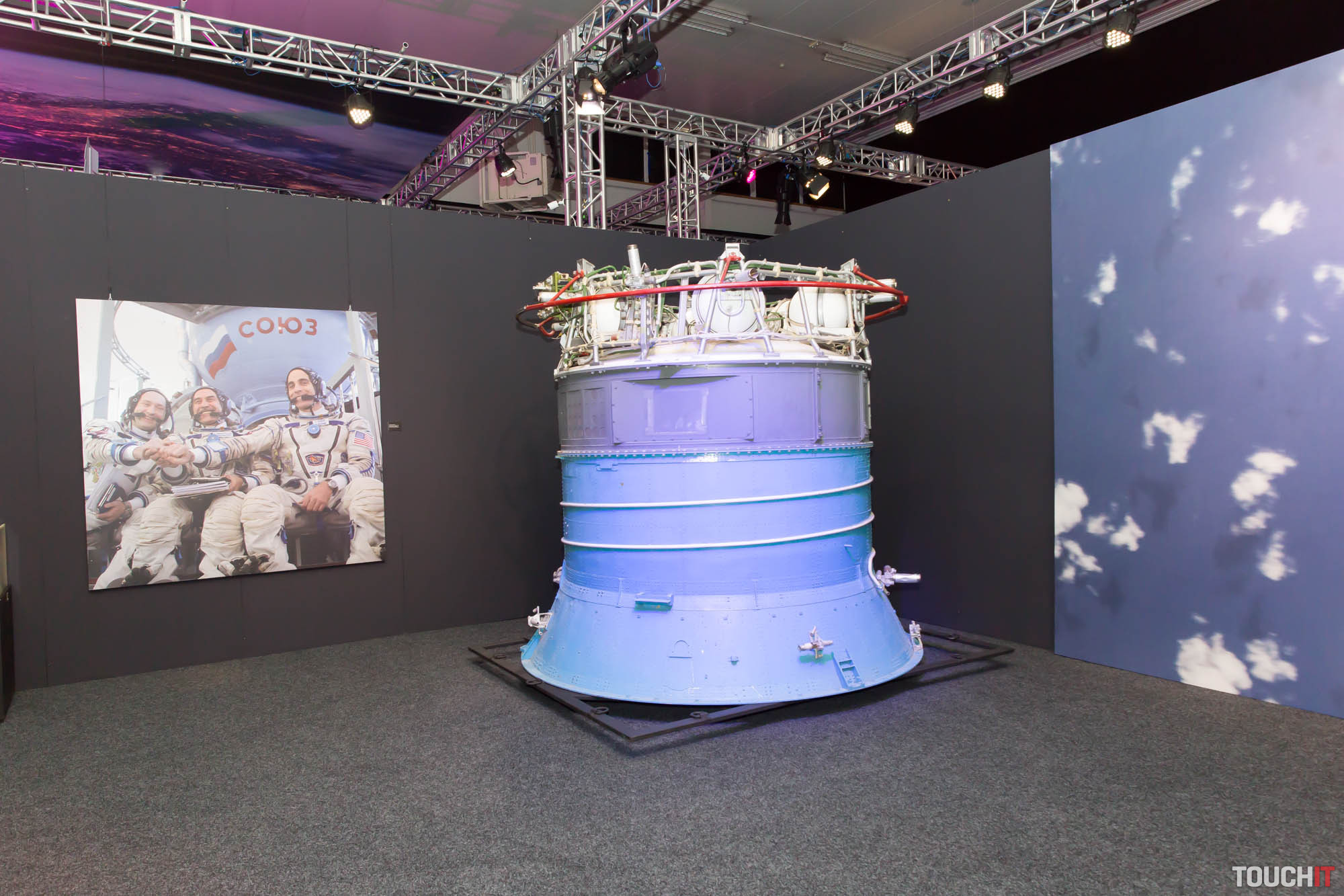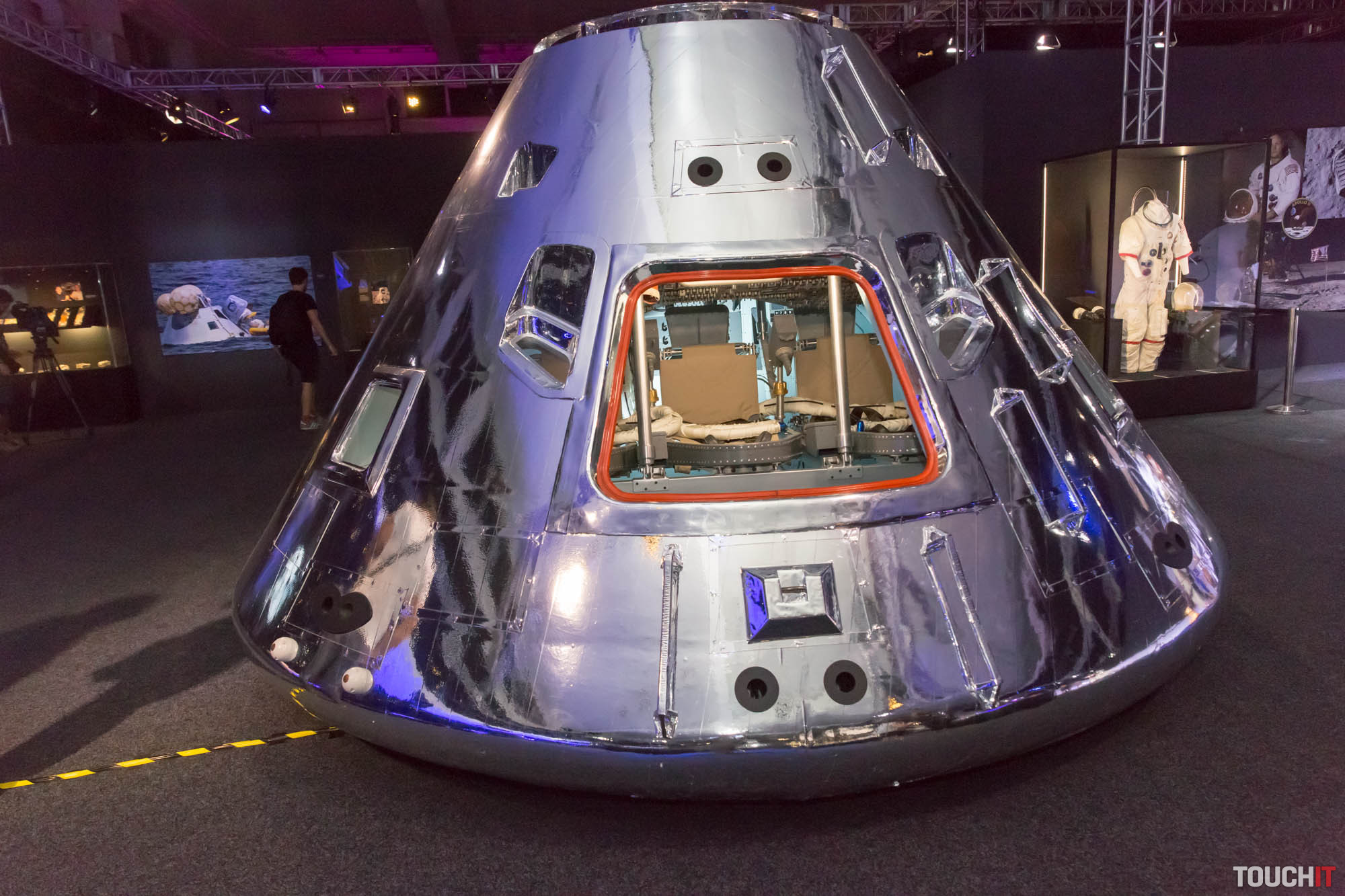 Asi najvzácnejší exponát výstavy – časť spaľovacieho motora, ktorý dopravil raketu na Mesiac. Tento stupeň sa pri lete rakety plánovane odpojil a dopadol do Atlantického oceána. Tu ostal veľa rokov a dnes je v Bratislave