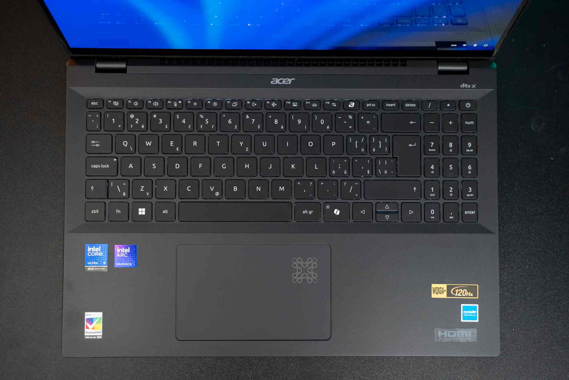 Klávesnica má 2 stupne bieleho podsvietenia a tlačidlo Copilot. To nahradilo pravý kláves Ctrl, ktorý by inak využili napríklad hráči. Aj keď to nie je herný notebook, treba stále zdôrazniť, že je vysokovýkonný pre občasných hráčov. Špecialitou je touchpad, ktorý obsahuje vizuálny prvok signalizujúci použitie umelej inteligencie. Pri využití AI bliká, no tento efekt sa dá vypnúť.