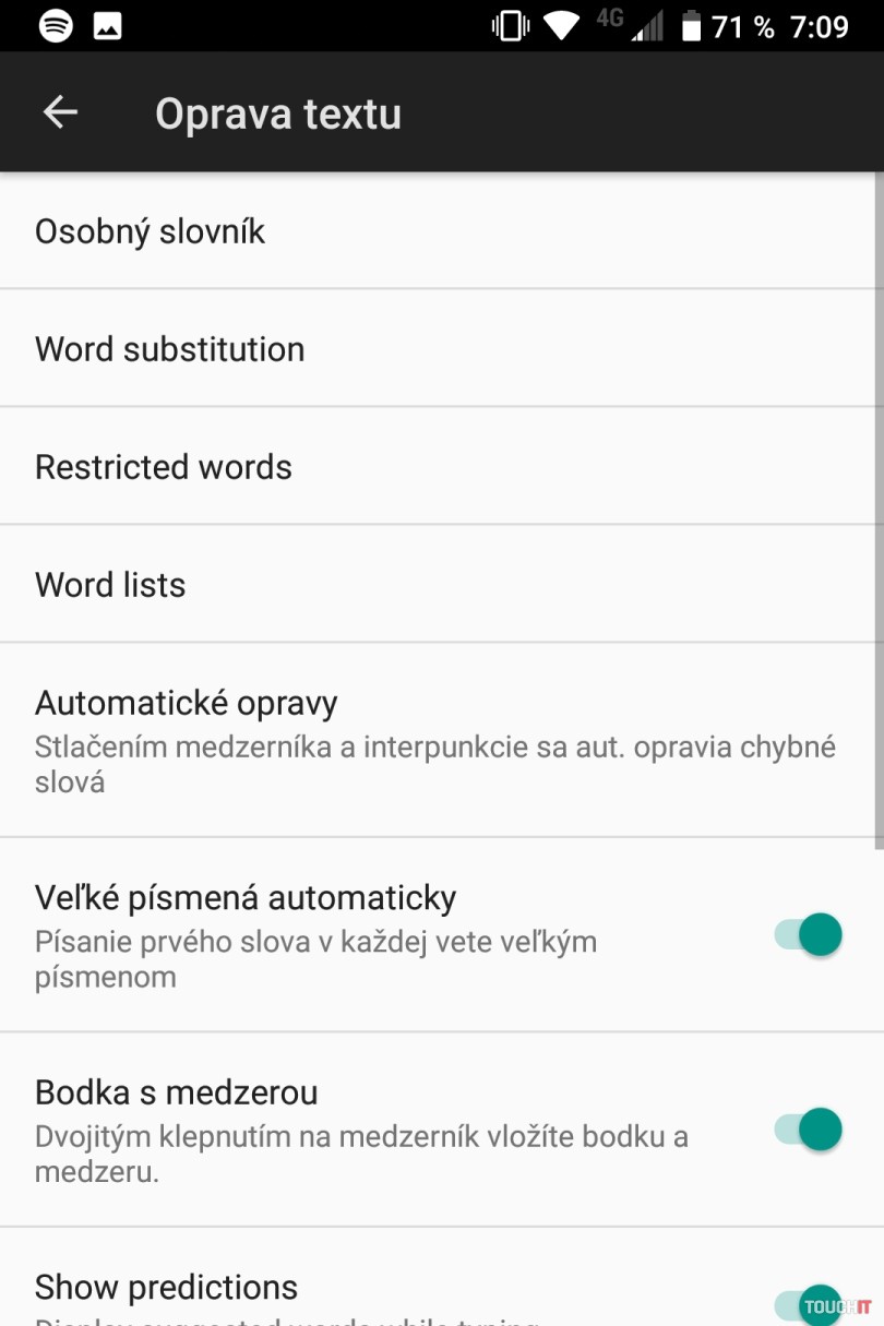 - Navrhovanie slov – 3 horúce zóny, stačí swajpnúť prstom po klávesnici nahor a vyberie sa konkrétne z trojice navrhnutých slov