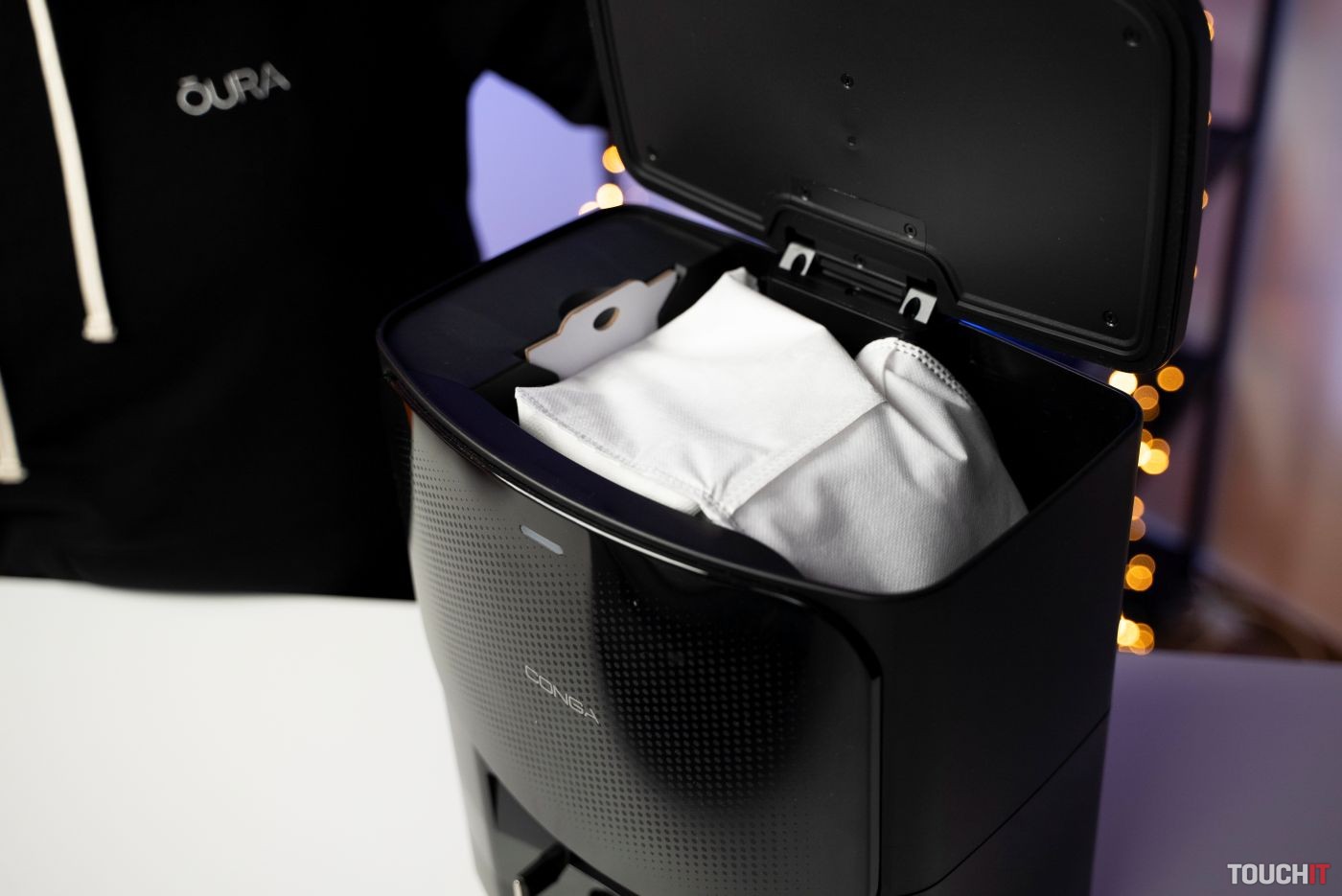 Dokovacia stanica ponúka funkciu automatického vyprázdňovania, čo je výborná vec. Táto funkcia fungovala spoľahlivo, vrecko v stanici má objem 3 litre. Dokovacia stanica neobsahuje plastovú podložku, takže je vhodné, aby ste po skončení mopovania čo najskôr odstránili mopovaciu podložku z vysávača. Modré svetlo na dokovacej stanici nie je možné vypnúť a svieti aj v noci.