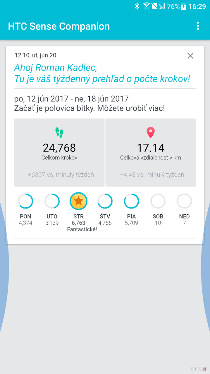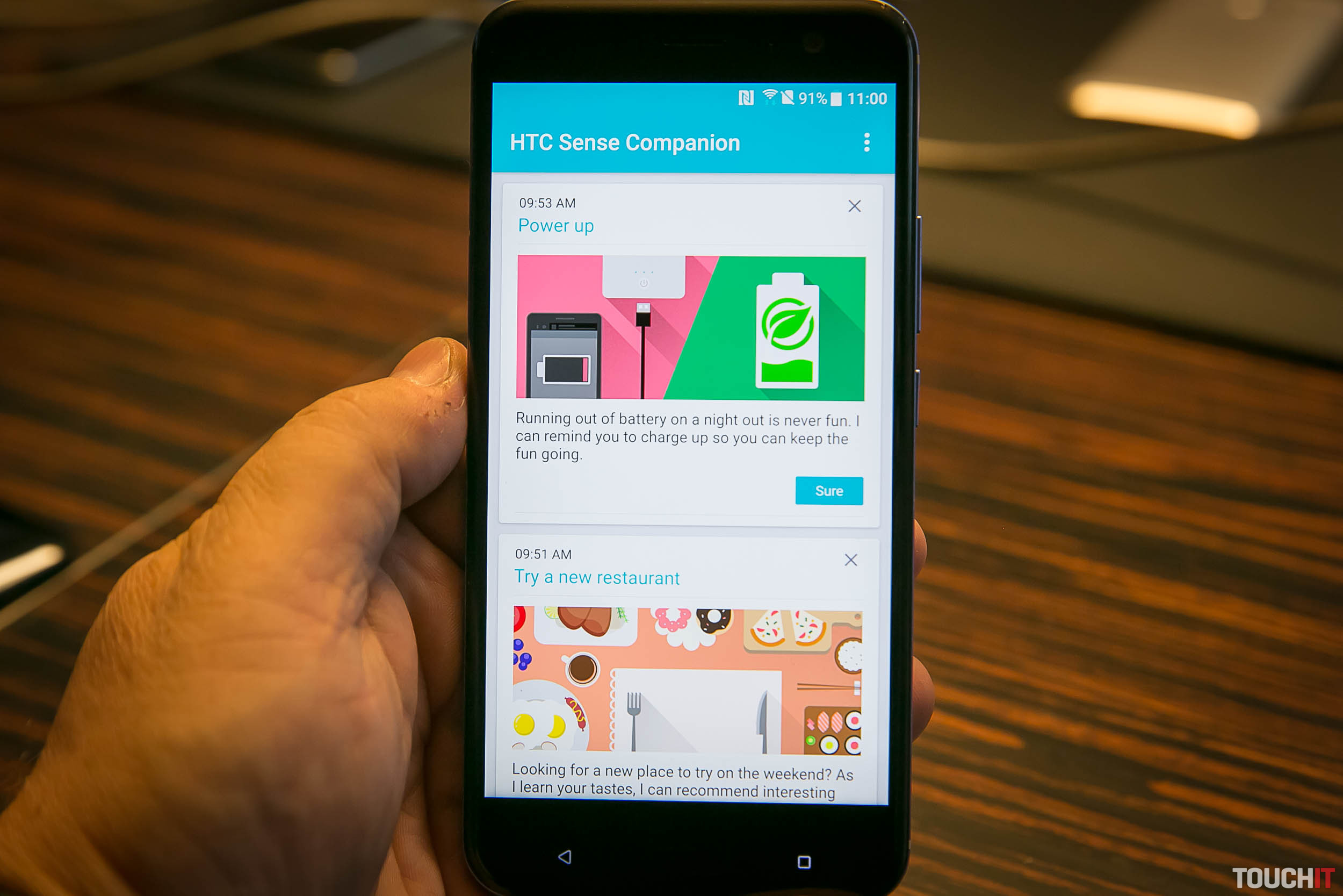 Súčasťou HTC Sense je aj virtuálny asistent HTC Sense Companion. O ňom sme písali už v recenzii na HTC U Ultra. Asistent vám začne posielať návrhy po cca dvoch týždňoch používania, pričom informuje o predpovedi počasia, vašej aktivite počas týždňa a pripomenie aj, aby ste nabili telefón či si zobrali powerbanku. Do úvahy berie udalosti z vášho kalendára. Taktiež odporučí zaujímavé miesta či reštaurácie v okolí, avšak takéto odporúčanie sme v Bratislave počas testovania nedostali. Prínos asistenta od HTC je diskutabilný, nakoľko podobné odporúčania posiela aj samotný Google Asistent. Ak vás bude HTC Sense Companion otravovať, môžete si funkciu vypnúť. V niektorých prípadoch sa však môže jeho odporúčanie hodiť. Napr. vás upozorní, ak je aktívny budík nastavený neskôr ako prvá schôdzka vo vašom kalendári.