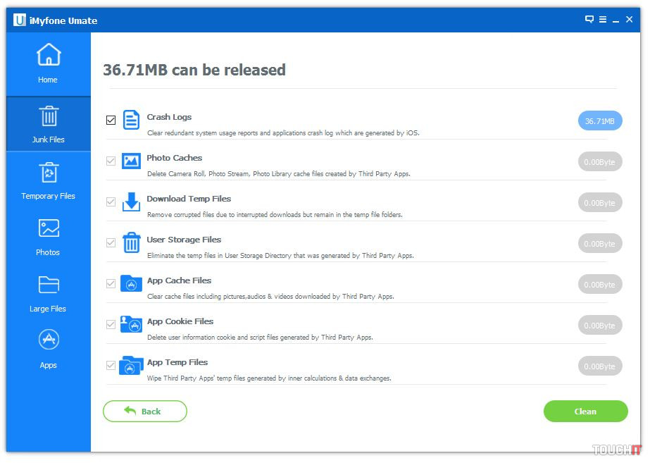 Skenovanie úložiska v iPhone je pomerne rýchle. V priebehu pár desiatok sekúnd máte k dispozícii zoznam položiek, ktoré môžete optimalizovať. V rámci nepotrebných súborov nám softvér uvoľnil 36 MB. Išlo najmä o logovacie súbory, ktoré sa po páde aplikácie posielajú vývojárom a reálne ich nepotrebujete. Čistenie dočasných súborov vám v snahe získať extra úložisko pomôže asi najviac. Proces trval v našom prípade až polhodinu (hoci aplikácia avizovala hodinu). Dôvod bol ten, že iMyfone kopíroval do telefónu veľký súbor, aby sa zaplnil zvyšok voľného miesta a vynútila sa systémová funkcia, ktorá automaticky maže nepotrebné dočasné súbory v prípade, že je „Úložisko takmer plné„. Na podobnom princípe funguje aj čistenie dočasných súborov v aplikácii Battery Doctor. V tomto prípade je však celý proces oveľa rýchlejší, trvá iba pár sekúnd. iOS aplikácia má výhody, že dokáže virtuálne zaplniť úložisko. V prípade externého nástroja, ako je iMyfone, je treba zaplniť úložisko kopírovaním reálnych dát. Čistenie dočasných súborov je niekedy vhodné spustiť aj niekoľkokrát za sebou, aby sa odstránili všetky nepotrebné dáta. Čím menej voľného miesta máte, tým rýchlejšie celý proces prebehne.Optimalizácia fotogalérie a vynútenie zmazania dočasných súborov vám pomôžu s uvoľňovaním úložiska najviac