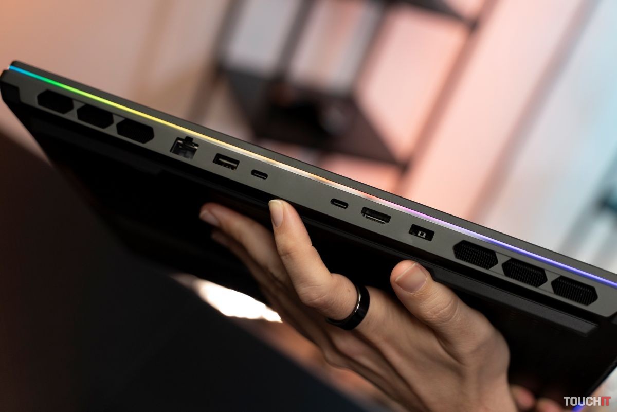 Čo sa portovej výbavy týka, jej prevedenie je praktické. Poruke naľavo je čítačka SD karty, vpravo sa nachádza USB port. Ďalšie porty sú na konci ľavej a pravej hrany a ide o 3,5 mm jack, resp. o USB-A port. Gro portovej výbavy sa následne nachádza na zadnej hrane, kde nájdete napájací port, ethernet, dva USB-C porty, jeden USB-A port a HDMI výstup.