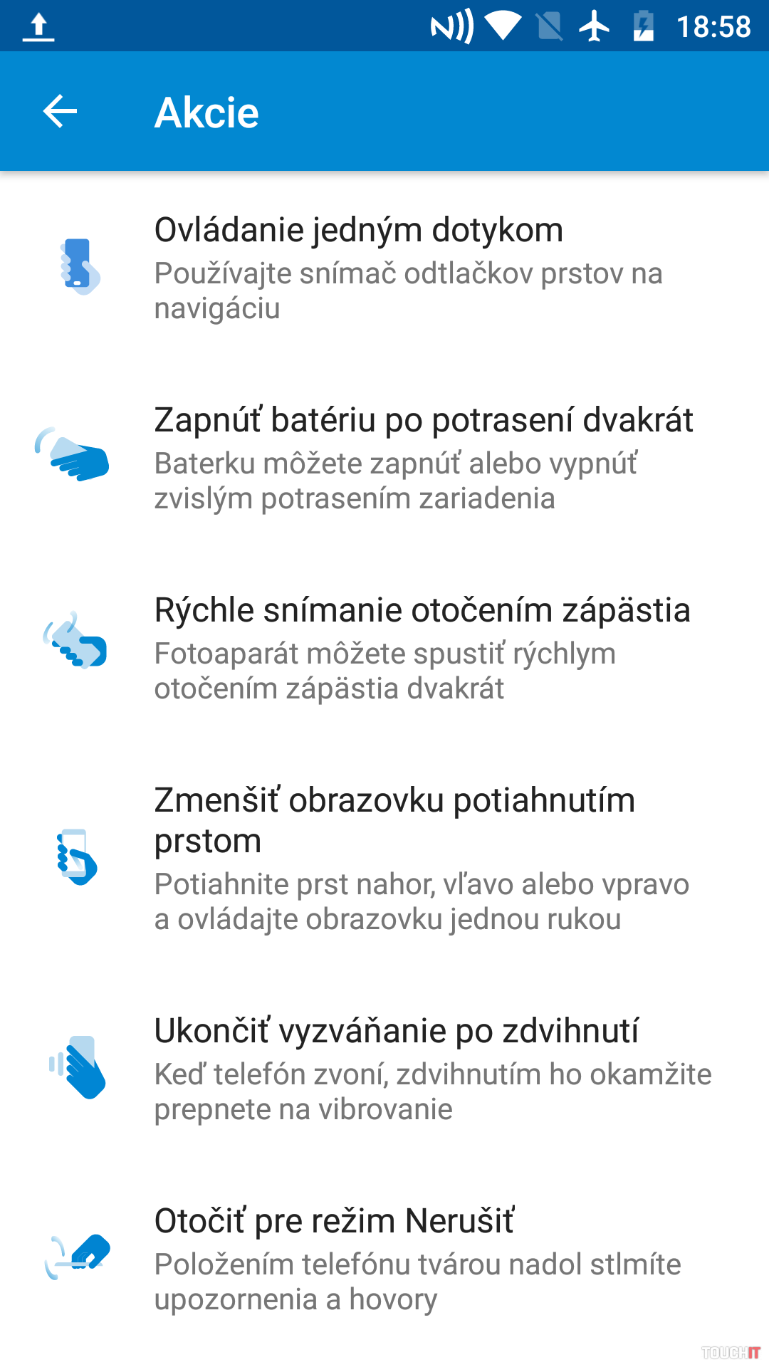Režimy práce s čítačkou odtlačkov prstov pri „Ovládaní jedným dotykom„:ťuknutie – návrat na domácu obrazovku