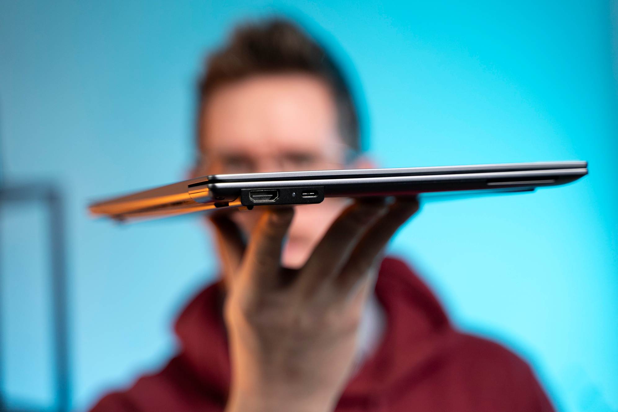 Vďaka tomuto prvku je hrubý len 13 mm a používateľ má k dispozícii základné porty, ktoré by mohol potrebovať. Keďže výrobca chcel priniesť čo najužší dizajn, obmedzil porty na dva Thunderbolt 4.0, HDMI a audiokonektor.