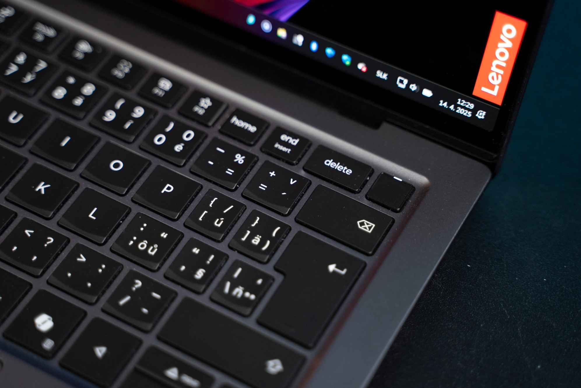 V pravom hornom rohu je tlačidlo na vypnutie. Má silný stisk a zároveň je to čítačka odtlačkov prstov. Do systému sa ale pohodlne prihlásite cez 8 Mpx infračervenú kameru. Rozhodne treba oceniť to, že na klávesnici je možné elektronicky uzamknúť prístup ku kamere cez klávesovú skratku s Fn a takisto aj vypnúť mikrofón. Sú to detaily, no používatelia, ktorí chcú chrániť svoje súkromie alebo chcú využívať vypnutie mikrofónu počas videokonferencie, ocenia tieto možnosti.