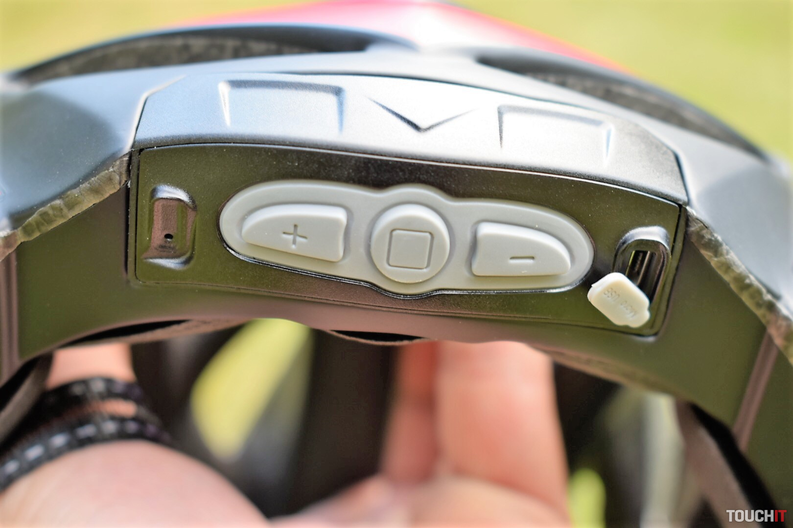 Keď si otočíme prilbu zospodu, tak sa nám naskytne pohľad na multimediálné centrum, kde v prednej časti prilby nájdeme gumené tlačidlá na zapnutie a vypnutie svetelnej signalizácie, príjem hovoru a reguláciu hlasitostí zvukov prehrávaných v integrovaných reproduktoroch, ako aj ovládanie voľby skladieb. V tomto module sa nachádza ešte mikrofón a MicroUSB vstup pre nabíjanie. Všetko je dobre izolované pred vstupom vody a potu.