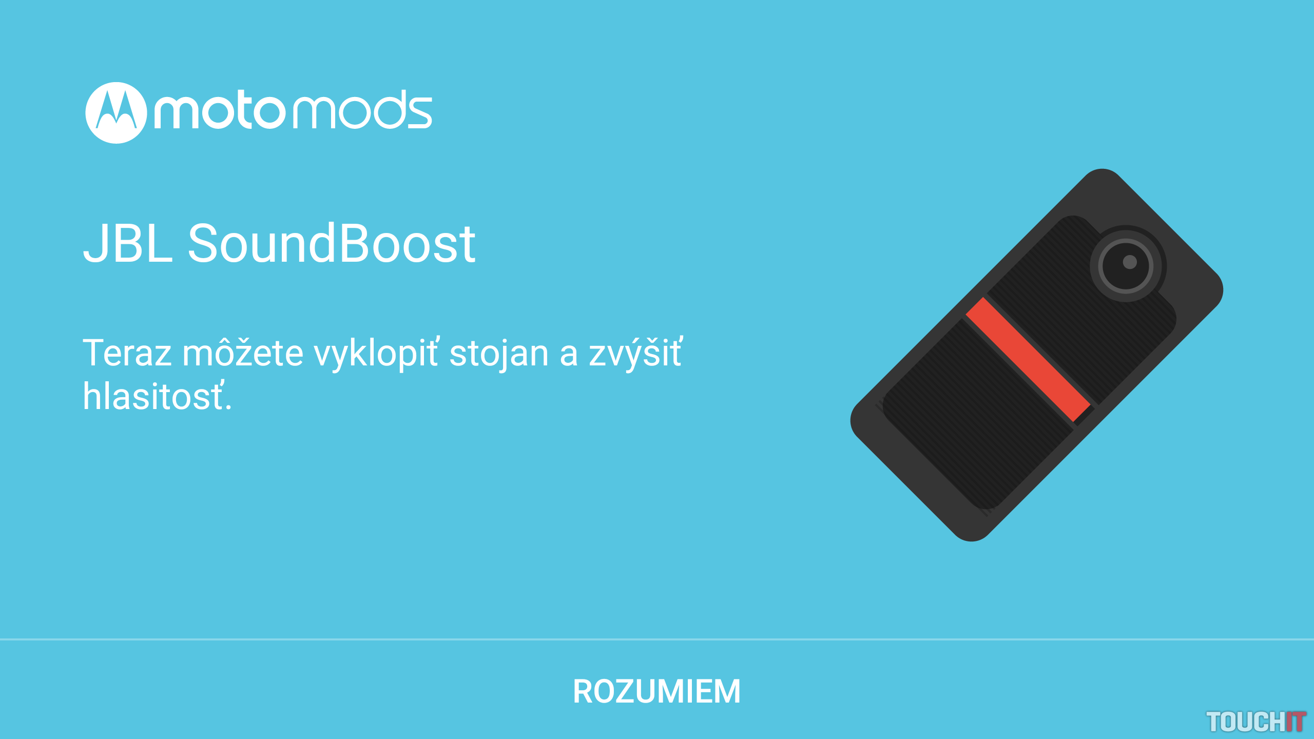 Čo sa ostatných modulov týka, JBL reproduktor rozdávajú operátori ako darček zadarmo pri kúpe telefónu. Tento koncept sa nám páči, pretože JBL SoundBoost je v praxi výborne využiteľný. Rozdiel pri prehrávaní zvuku z reproduktora telefónu a zo stereo reproduktorov v prípade tohto modulu budete počuť hneď. Rozdiel si všimnete nielen v hlasitosti, ale aj v kvalite zvuku a najmä v basoch. Modul obsahuje batériu s kapacitou 1000 mAh, na jedno nabitie vydrží fungovať 10 hodín. Cena modulu je bežne 99 eur a vieme si reálne predstaviť, že by sme ho so sebou nosili na dovolenky namiesto externého reproduktora.