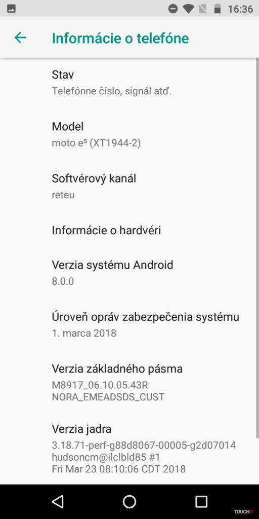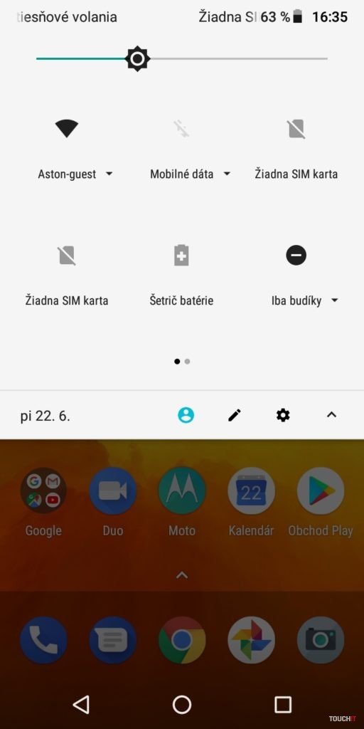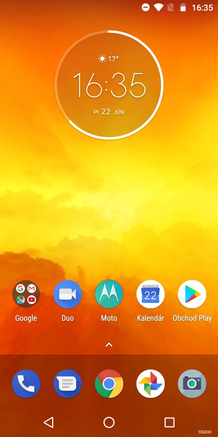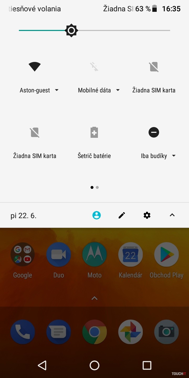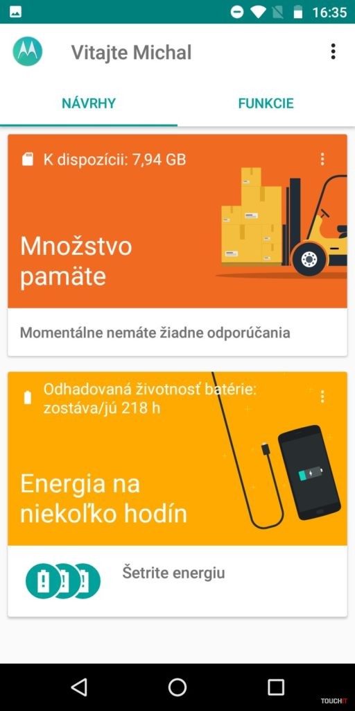 Snapdragon 425. To je niečo, čo vám veľa napovie. Procesor pre lacné zariadenia s priemerným výkonom. Viac by prospelo navýšenie kapacity RAM. Tu je totiž len 2 GB kapacita. Úložisko má veľkosť 16 GB. Veľmi diplomaticky povedané, rýchlo si vložte do telefónu pamäťovú kartu. Toto za pár dní zaplníte ani neviete ako. Pár appiek, nejaká fotka a ste nahratí. Zastavíme sa ešte pri displeji. Ten je takmer štandardný až na jeden malý detail. Je zrezaný po hranách. Nie ale do oblúka ale uhlopriečkou v 45° uhle. Je to nebadateľný prvok, ktorého sme si takmer nevšimli. Ide o akými trend odrezať z displeja po jeho rohoch. Našťastie to v praxi nijako neovplyvňuje aplikácie a ich zobrazenie. Skôr sme prekvapení tým, že to sem výrobca dal a išiel takpovediac s trendom. Za silnú stránku považujeme batériu. Je tu čistý Android a tak 4000 mAh dobre vynikne. Áno, aj vďaka úspornému (menej výkonnému) procesoru. Skupina používateľov, ktorí chcú naozaj celodennú výdrž od rána do večera, budú s týmto telefónom spokojní. Hodí sa aj na dlhšie výlety, kedy v režime pohotovosti nespotrebováva takmer žiadnu energiu. Ideálny spoločník na trojdňovú chatu. Najmä ak ho potrebujete mať ako zariadenie na prijatie hovoru a takpovediac, aby ste boli v dosahu. Avšak aj pri plnom využívaní si nemusíte so sebou v rámci dňa nosiť nabíjačku. Dokonca ani fotoaparát ho nijako drasticky nevybíja. Odomykanie tvárou tu na rozdiel od moto g6 / moto g6 Plus nie je. Potrebujete na to silnejší procesor a hlavne selfie kameru s vyšším rozlíšením. Vzhľadom na celkové možnosti a hardvérovú výbavu, chýbajú niektoré možnosti vylepšení Moto. Dostupné sú Moto Akcie a Moto Obrazovka. Moto Akcie – rozšírenie napojené na hardvérové snímače. Vďaka nim môžete spustiť fotoaparát zakývaním smartfónu, spustiť LED blesk do funkcie baterky, odfotiť obrazovku tromi prstami atď. Všetko užitočné veci a vy sami si vyberáte, ktoré z Moto akcií chcete mať aktívne. Moto Obrazovka – tu sa nastavuje nočný displej, ponechanie obrazovky zapnutej, ak sa na ňu pozeráte ale aj notifikácie. To znamená, že smartfón zobrazí upozornenia, keď do neho ťuknete. Vtedy sa na tmavom displeji inverzne zobrazujú ikony aplikácií, v ktorých nastala udalosť. Cez tieto zobrazenia sa dajú aplikácie ovládať. Napríklad prepínať sa medzi skladbami pri počúvaní Spotify, alebo zareagovať na prichádzajúce správy.