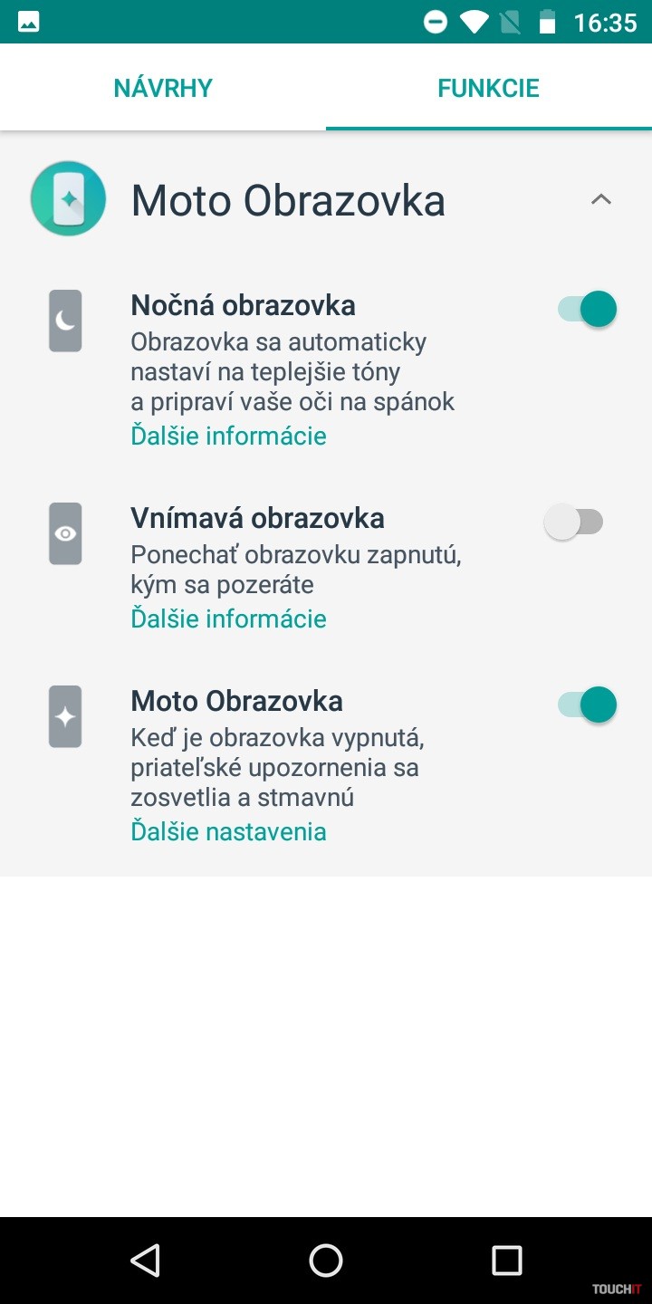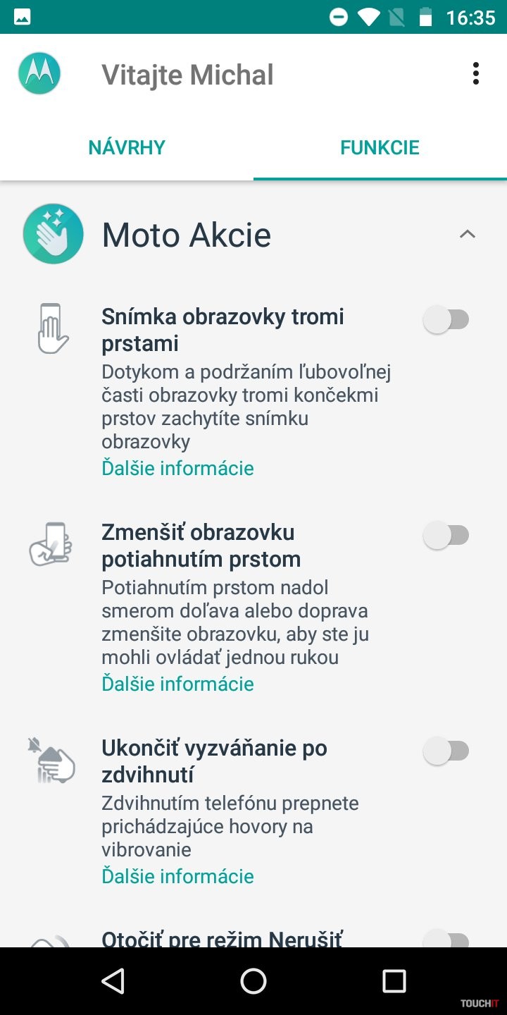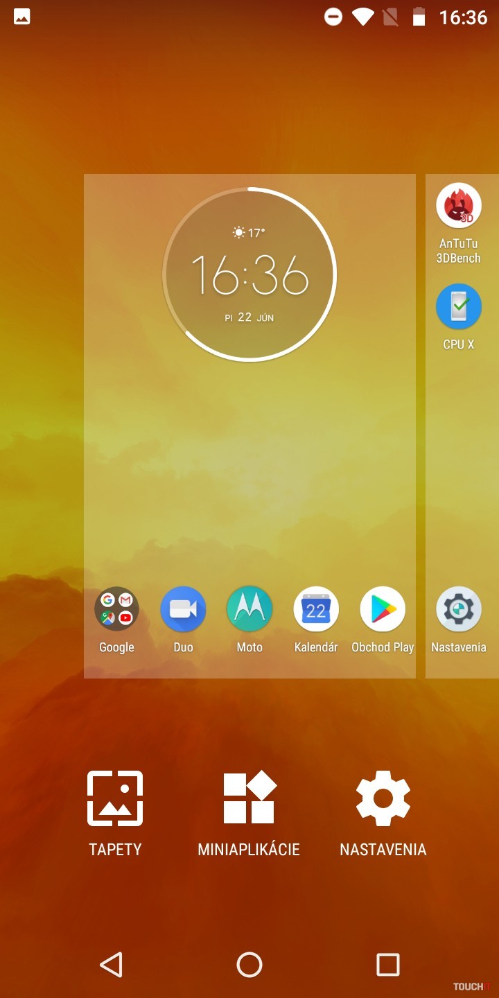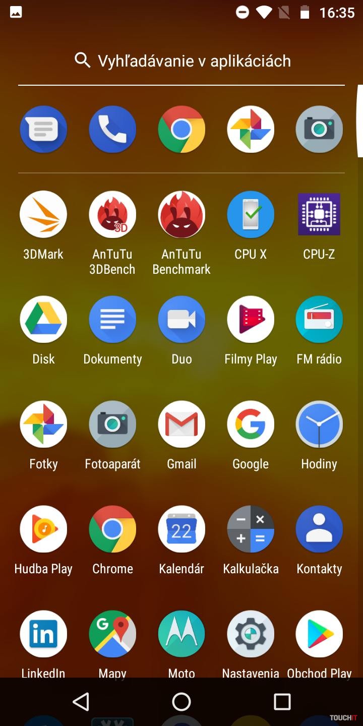 Snapdragon 425. To je niečo, čo vám veľa napovie. Procesor pre lacné zariadenia s priemerným výkonom. Viac by prospelo navýšenie kapacity RAM. Tu je totiž len 2 GB kapacita. Úložisko má veľkosť 16 GB. Veľmi diplomaticky povedané, rýchlo si vložte do telefónu pamäťovú kartu. Toto za pár dní zaplníte ani neviete ako. Pár appiek, nejaká fotka a ste nahratí. Zastavíme sa ešte pri displeji. Ten je takmer štandardný až na jeden malý detail. Je zrezaný po hranách. Nie ale do oblúka ale uhlopriečkou v 45° uhle. Je to nebadateľný prvok, ktorého sme si takmer nevšimli. Ide o akými trend odrezať z displeja po jeho rohoch. Našťastie to v praxi nijako neovplyvňuje aplikácie a ich zobrazenie. Skôr sme prekvapení tým, že to sem výrobca dal a išiel takpovediac s trendom. Za silnú stránku považujeme batériu. Je tu čistý Android a tak 4000 mAh dobre vynikne. Áno, aj vďaka úspornému (menej výkonnému) procesoru. Skupina používateľov, ktorí chcú naozaj celodennú výdrž od rána do večera, budú s týmto telefónom spokojní. Hodí sa aj na dlhšie výlety, kedy v režime pohotovosti nespotrebováva takmer žiadnu energiu. Ideálny spoločník na trojdňovú chatu. Najmä ak ho potrebujete mať ako zariadenie na prijatie hovoru a takpovediac, aby ste boli v dosahu. Avšak aj pri plnom využívaní si nemusíte so sebou v rámci dňa nosiť nabíjačku. Dokonca ani fotoaparát ho nijako drasticky nevybíja. Odomykanie tvárou tu na rozdiel od moto g6 / moto g6 Plus nie je. Potrebujete na to silnejší procesor a hlavne selfie kameru s vyšším rozlíšením. Vzhľadom na celkové možnosti a hardvérovú výbavu, chýbajú niektoré možnosti vylepšení Moto. Dostupné sú Moto Akcie a Moto Obrazovka. Moto Akcie – rozšírenie napojené na hardvérové snímače. Vďaka nim môžete spustiť fotoaparát zakývaním smartfónu, spustiť LED blesk do funkcie baterky, odfotiť obrazovku tromi prstami atď. Všetko užitočné veci a vy sami si vyberáte, ktoré z Moto akcií chcete mať aktívne. Moto Obrazovka – tu sa nastavuje nočný displej, ponechanie obrazovky zapnutej, ak sa na ňu pozeráte ale aj notifikácie. To znamená, že smartfón zobrazí upozornenia, keď do neho ťuknete. Vtedy sa na tmavom displeji inverzne zobrazujú ikony aplikácií, v ktorých nastala udalosť. Cez tieto zobrazenia sa dajú aplikácie ovládať. Napríklad prepínať sa medzi skladbami pri počúvaní Spotify, alebo zareagovať na prichádzajúce správy.