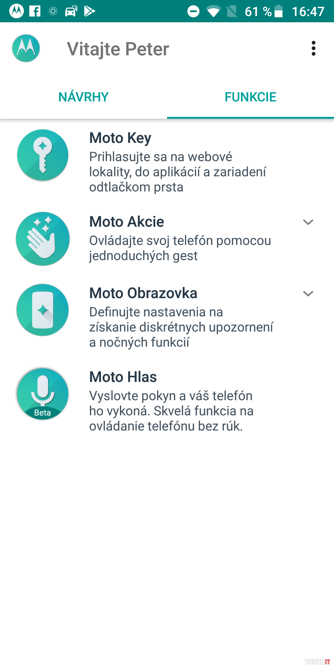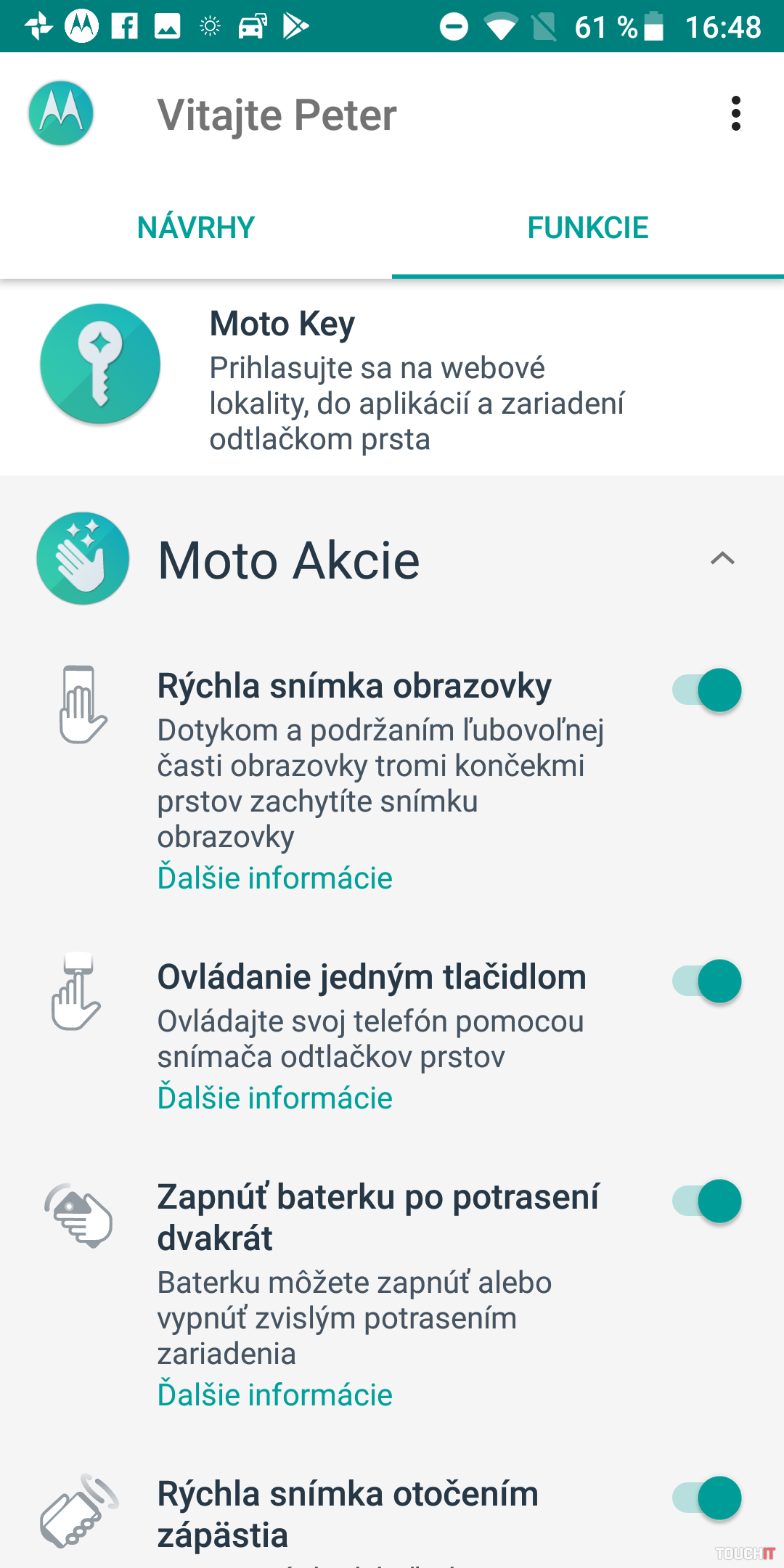 Po vybalení z krabičky vás privíta čistý Android 8.0 so šikovnými vylepšeniami od Motoroly. Tie sú sústredené do aplikácie Moto, ktorá obsahuje štyri základné oblasti:Moto Key- umožňuje prihlásenie do aplikácií a webových lokalít v systéme Windows iba dotykom prsta
