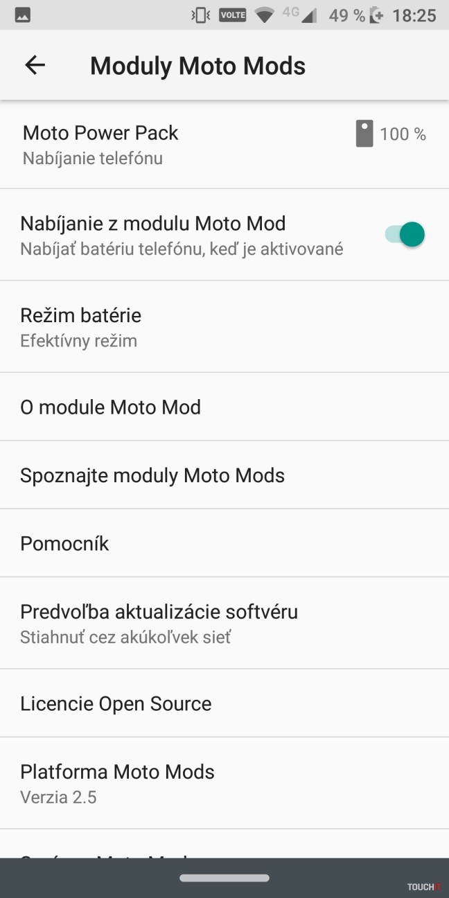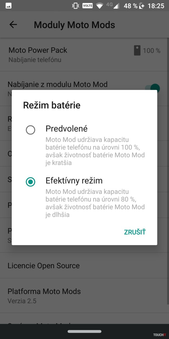Dá sa nosiť s telefónom, nepotrebujete žiadny USB kábel na prepojenie a priamo v menu sa dá vybrať, či chcete, aby sa z nej telefón nabíjal. Môže byť teda založená na zadnom tele moto z3 Play ale nemusí ho nabíjať. Takisto si určujete, či chcete predvolený ale efektívny režim nabíjania.
