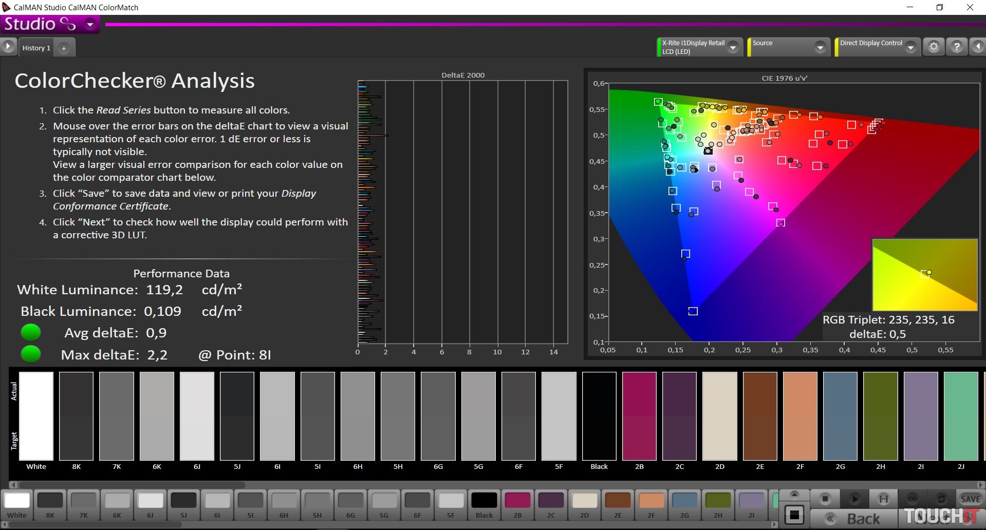 PV3200PT sme následne kalibrovali pomocou redakčnej sondy a výsledky testu boli výborné. Priemerná odchýlka DeltaE na úrovni 0,9 a maximálna na úrovni 2,2. Maximálnu odchýlku spôsobil jeden odtieň hnedej farby, inak sa všetky držali pod hranicou 1,8. BenQ z hľadiska nameraných hodnôt chválime, takúto nízku priemernú odchýlku sme zatiaľ nenamerali v prípade žiadneho iného monitora. Väčšinou síce testujeme „