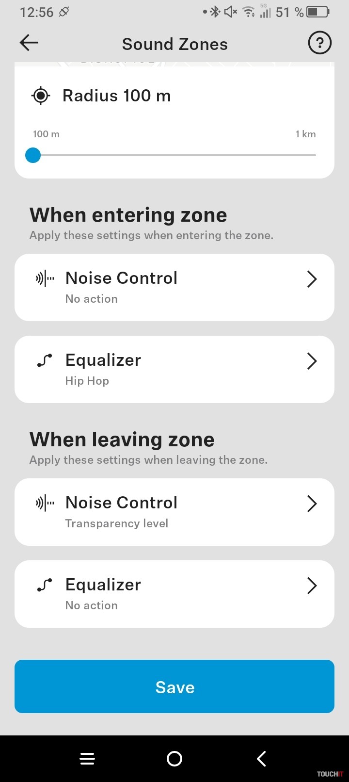 Táto funkcia je známkou vyššej kategórie slúchadiel. V aplikácii nastavíte takzvané aktívne zóny, na základe ktorých sa prispôsobí režim odhlučnenia a ekvalizér. Ocenil som výber vlastného rádiusu od 100 m až po 1 km. Zároveň je k dispozícii nastavenie pre vstup do vami definovanej zóny a pre jej opustenie.