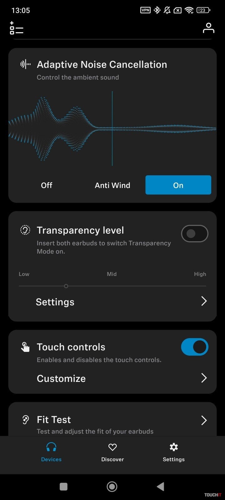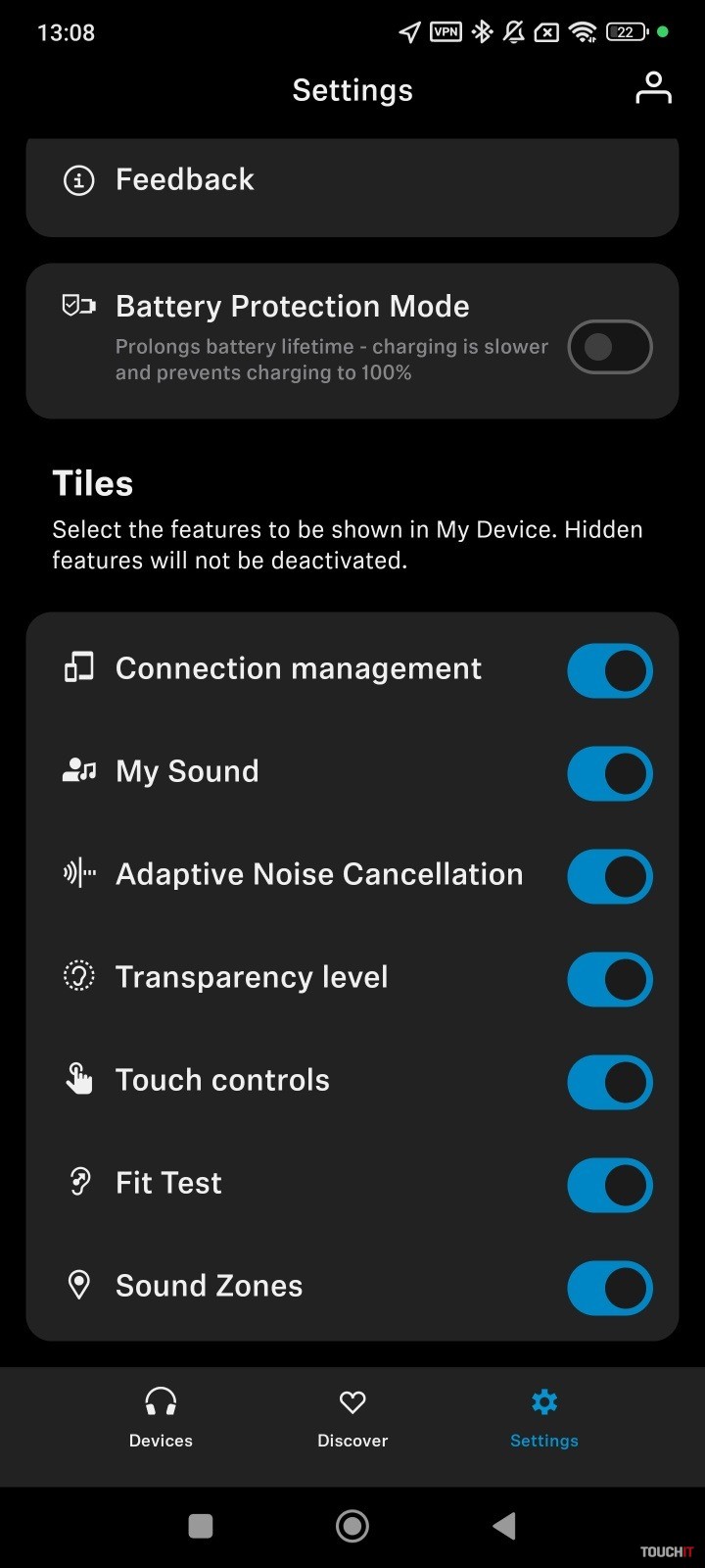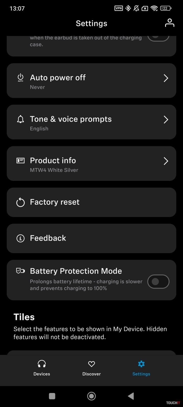 Slúchadlá majú prepracovanú aplikáciu, ktorá zobrazuje stav nabitia slúchadiel ako aj nabíjacej škatuľky. Súčasťou personalizácie je možnosť navrhnúť si, čo všetko sa bude na hlavnej stránke aplikácie zobrazovať. Takto si môžete rozvrhnúť zobrazenie dlaždíc podľa seba. Štandardne je k dispozícii nastavenie zvukových profilov, vrátane ekvalizéra s možnosťou zosilnenia basového účinku.