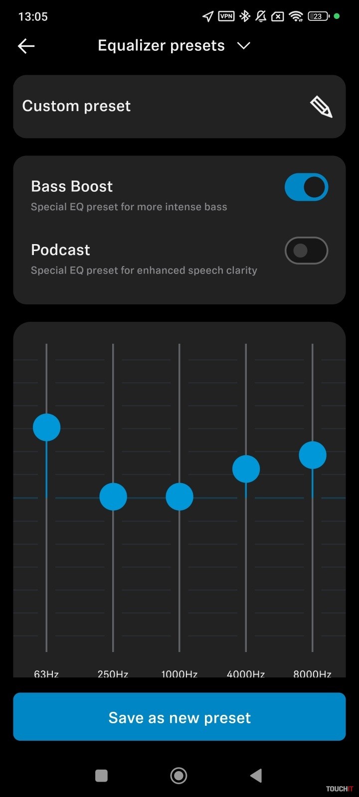 Špeciálnou súčasťou je režim ekvalizéra s názvom Podcast. Je vhodný na počúvanie hovoreného slova. Ide o vynikajúcu možnosť pre všetkých, ktorí radi počúvajú podcasty, no zároveň chcú mať jednoduchú predvoľbu na aktiváciu tohto režimu. Je samozrejme na každom z vás, ako si ekvalizér prispôsobíte a takisto sa dá tento režim vypnúť a nastaviť si ekvalizér podľa seba. Každú zmenu si môžete uložiť pod svojím názvom.