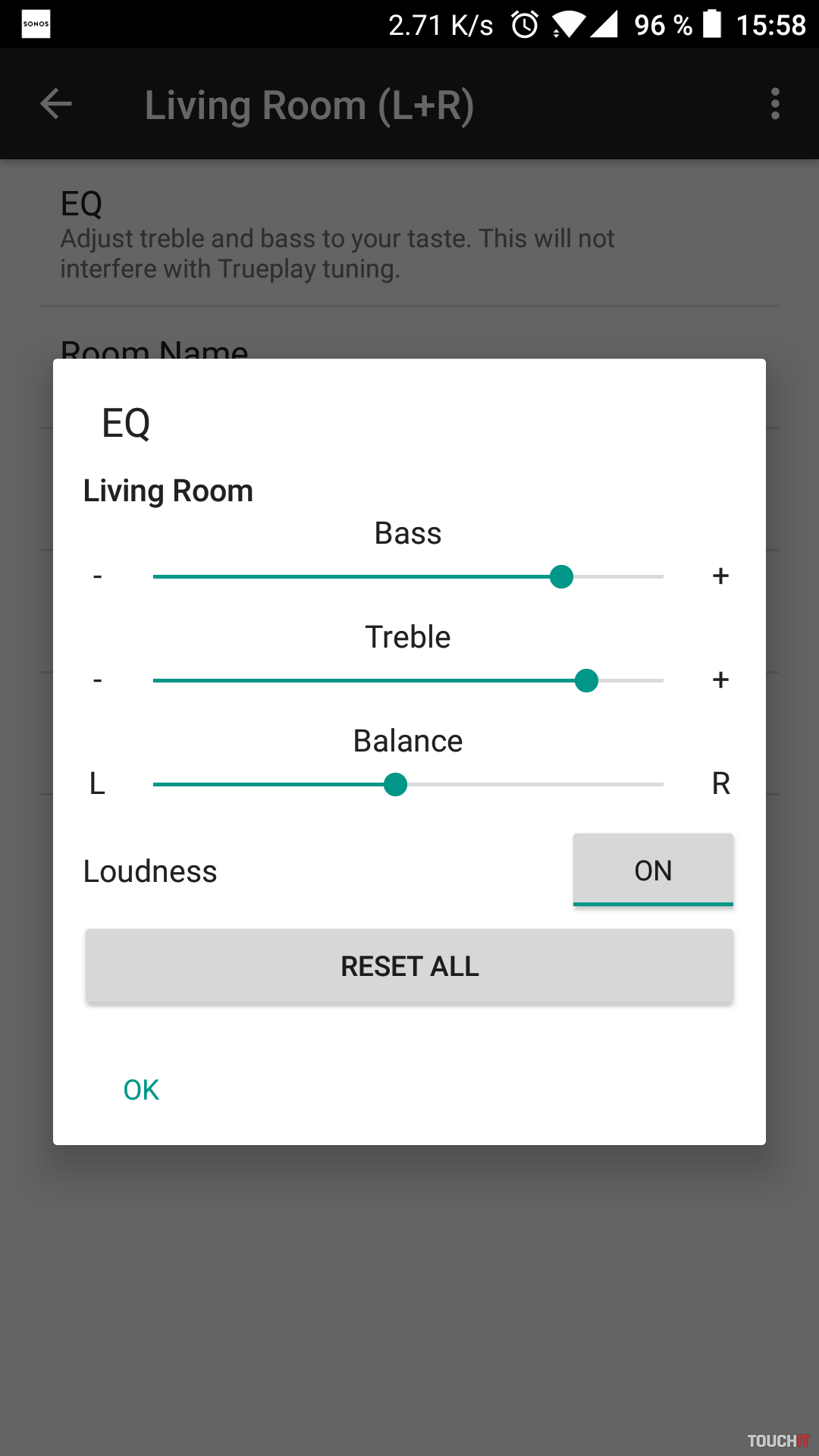 Po prvom nastavení a zapojení reproduktorov do domácej WiFi siete sme si pridali službu Deezer a Plex a začali prehrávať. Výrobné nastavenie nás trochu uzemnilo prebasovaným zvukom, takže sme hneď v Sonos aplikácií (stiahnutá z Google Play) vyhľadali ekvalizér a zvuk si doladili. Trochu nás sklamalo, že ekvalizér ponúka len nastavenie výšok, basov, nastavenie loudness a nastavenie vyváženia ľavej a pravej strany.