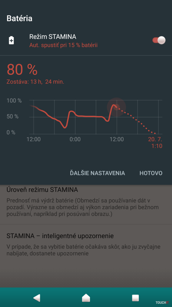 Na pravej bočnej hrane sa nachádza tlačidlo na reguláciu hlasitosti ako aj hardvérové tlačidlo spúšte fotoaparátu. To sme pravidelne využívali. Ocenili sme, že je dvojpolohové, takže pomocou neho môžete aj ostriť na stred scény, resp. na označený objekt. Ľavý bok obsahuje samostatný slot pre microSD kartu a samostatný slot pre nano SIM kartu. Na zadnej strane nájdete nový 19 Mpx fotoaparát s funkciou nahrávania super spomalených videí pri 960 fps. O tejto funkcii informuje v sekcii fotoaparátu. Xperia XZ Premium ponúka 3230 mAh batériu a tá sľubuje dobrú výdrž. V závislosti od vášho používania sa môže pohybovať na úrovni 1 – 2 pracovných dní. Ak budete telefón využívať aj pre účely častého hrania alebo budete sledovať veľa videa v 4K rozlíšení, potom ho v niektorých prípadoch bude potrebné nabiť aj častejšie ako raz za 24 hodín. Nechýba režim STAMINA, ktorý predlžuje výdrž batérie, pričom si môžete vybrať z trochu nastavení a režimu Ultra STAMINA. Ten obmedzí funkcie telefónu iba na potrebný základ. Je taktiež praktické, že telefón vám posiela notifikácie, v ktorých vás upozorňuje na predpokladaný čas vybitia batérie. Do úvahy pritom berie váš typický spôsob používania telefónu. Niekedy sa to môže hodiť a ak vás budú notifikácie otravovať, môžete si ich vypnúť.