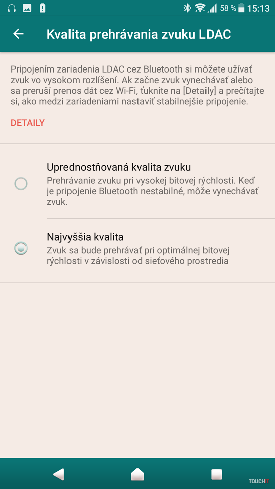 Novinka takisto ponúka technológiu Qnovo, ktorá je súčasťou Xperia telefónov od minulého roka. Táto technológia berie do úvahy vaše zvyky nabíjania telefónu a pokiaľ pravidelne dávate telefón do nabíjačky v noci, prispôsobí jeho nabíjanie tak, aby sa optimalizovala životnosť batérie. Inak povedané, technológia vie, že telefón sa nemusí cez noc nabiť na 100% plnou rýchlosťou a nabíjanie od 90% do 100% preto prebieha spomalene. Sony tvrdí, že táto technológia môže spomaliť degradáciu batérie a predĺžiť jej životnosť až dvojnásobne. Ak sa využíva Qnovo nabíjanie, telefón vás upozorní a informuje aj o približnom čase, kedy sa telefón nabije na 100%. V prípade potreby sa môžete priamo z notifikácie prepnúť na štandardné nabíjanie a Xperia XZ Premium podporuje aj technológiu rýchleho nabíjania Quick Charge 3.0. Z ďalšej výbavy stojí za zmienku podpora prenosových rýchlostí mobilného internetu až do 1 Gbps, dual-band Wi-Fi a/b/g/n/ac a Bluetooth 5.0. Telefón podporuje Hi-Res Audio a technológiu LDAC, vďaka čomu si môžete dopriať vyššiu kvalitu zvuku aj v prípade bezdrôtových slúchadiel. Pri nastavení LDAC si môžete zvoliť, či sa má preferovať stabilita prehrávaného zvuku alebo zvuková kvalita. Pri používaní slúchadiel vonku odporúčame nastavenie stability, pri počúvaní doma využijete nastavenie kvality. Aj v tomto smere novinka ponúka prémiovú výbavu.