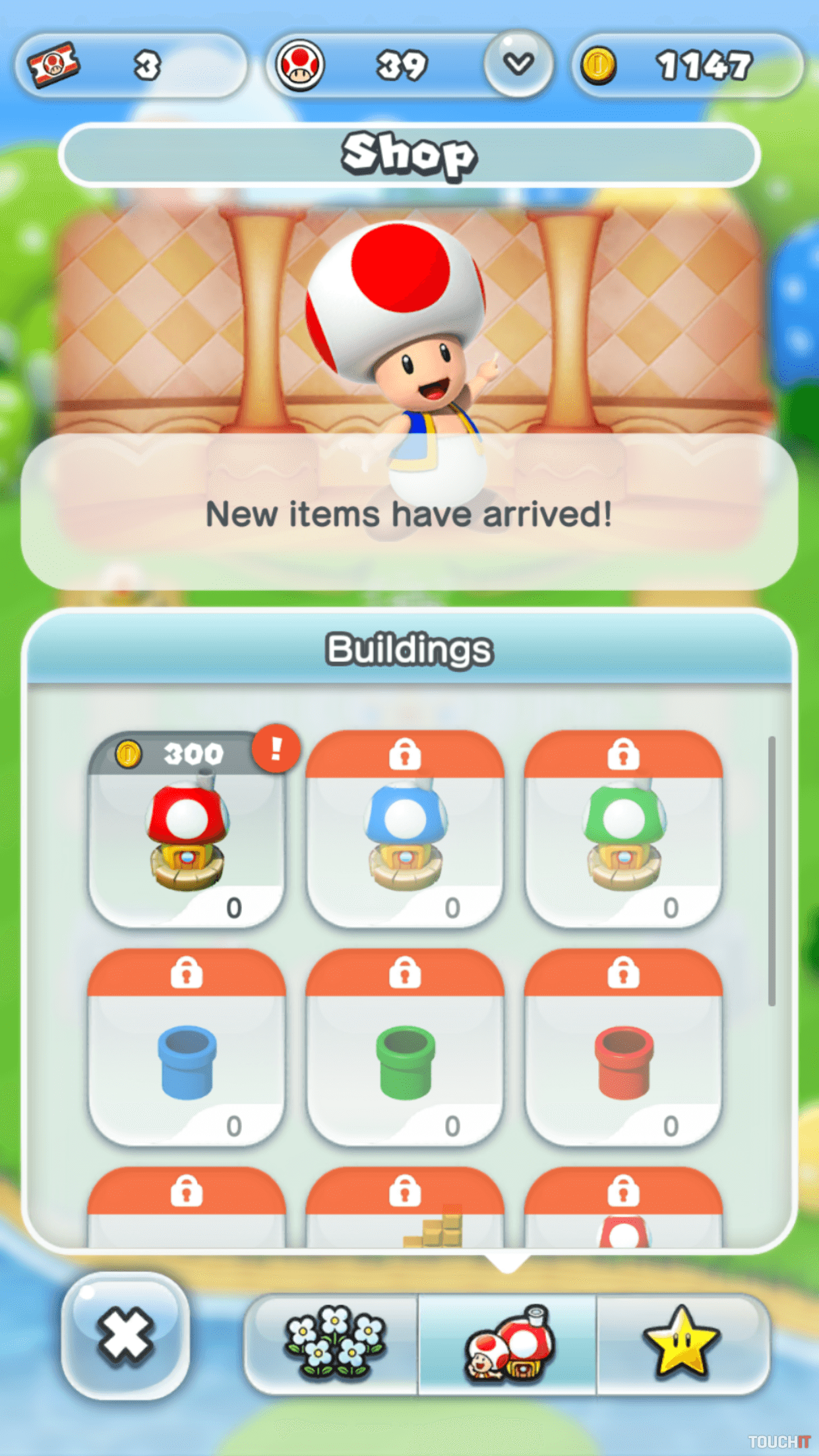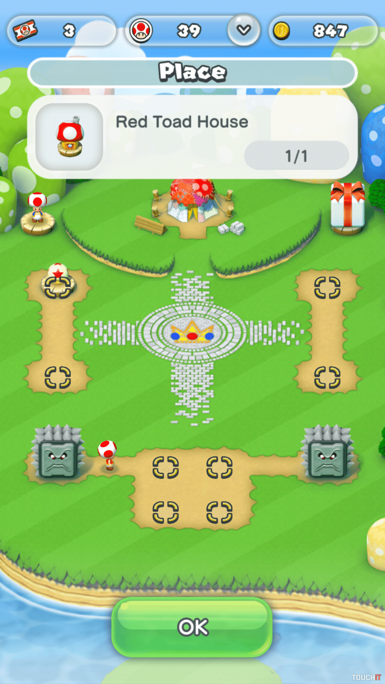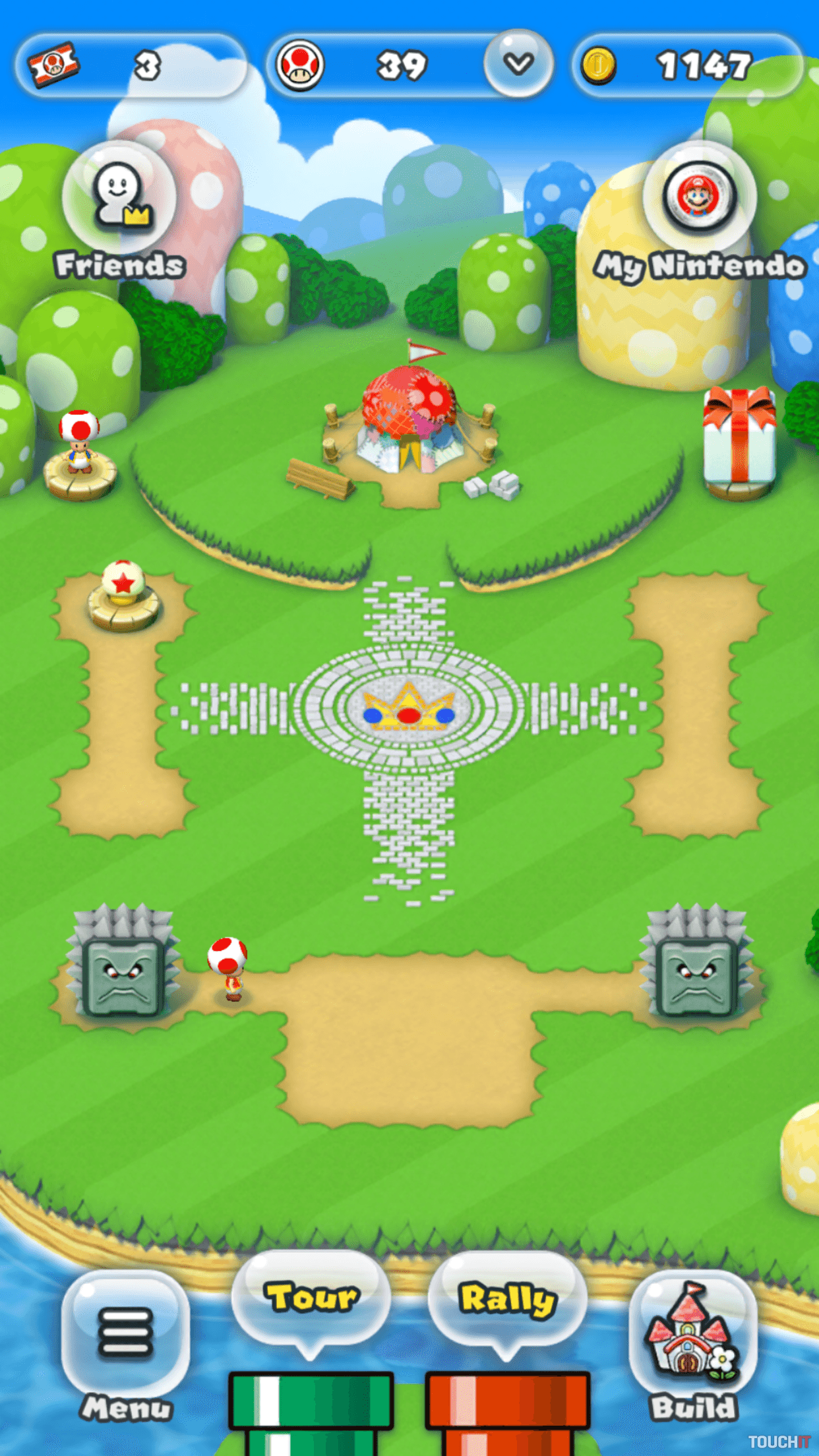 3 režimy, ovládanie jedným prstom Super Mario Run ponúka 3 režimy. Tzv. Tour je príbehovou kampaňou, ktorá obsahuje 24 úrovní. V demo verzii si zahráte prvé 3 úrovne, následne si treba zakúpiť plnú verziu za 9,99 eur. Jednotlivé úrovne sú pomerne krátke, dokončíte ich do 2 minút. Hra je navrhnutá pre tzv. casual hráčov, takže veľkú výzvu nečakajte. Niežeby boli úrovne vyslovene ľahké, ale hra vám dá v každom leveli 3 životy a to je vzhľadom k ich krátkosti viac než dostatok. Super Mario Run je prispôsobený jednoduchému ovládaniu, ktoré dotykové mobilné zariadenia vyžadujú. Mario automaticky beží a vy ťukaním na displej aktivujete skok, resp. regulujete jeho výšku. V praxi to funguje dobre a aj napriek jednoduchej hrateľnosti sa môžete pri hraní zapotiť – ak sa rozhodnete získať čo najviac bodov zbieraním mincí a ničením nepriateľov. Ak chcete v hraní excelovať, budete sa jednotlivé úrovne učiť takmer naspamäť, avšak väčšina hráčov pravdepodobne iba rýchlo prebehne všetky levely a tam ich hranie skončí. Druhým režimom je Rally, ktorý ponúka rovnaký koncept hrania. Súperíte však s „duchom“ iného hráča a snažíte sa získať čo najviac mincí, ovládať Maria čo najelegantnejšie a bez zbytočných úmrtí. Víťaz získa obyvateľov do svojho kráľovstva, ktoré môže v treťom režime stavať a vylepšovať. Ak prehráte, časť z nich stratíte a musíte ich opätovne získať. Rally je v podstate klasickým príkladom nekonečnej behačky, ktorej jediným účelom je vylepšovať skóre a získavať nové predmety. Hra vás však limituje, koľko krát môžete v tomto režime hrať a neskôr budete musieť čakať na denný prídel vstupeniek.Hra umožňuje stavať a vylepšovať svoje kráľovstvo