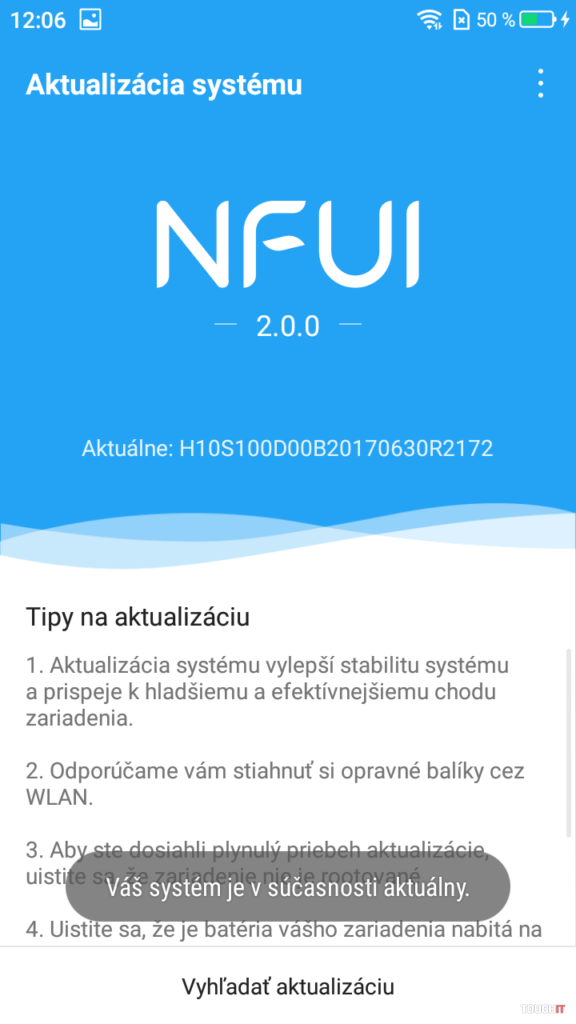 Počas testovania sme mali v telefóne Android 6.0, no objavila sa aktualizácia na Android 7.0. Rozhranie výrobca upravil podľa svojich predstáv. Je tu nadstavba NFUI 2.0 (v Androide 6.0 bola NFUI 1.0), ktorá podľa nás vôbec nezaťažuje systém, podporuje zmenu témy na jednu zo šiestich predinštalovaných.