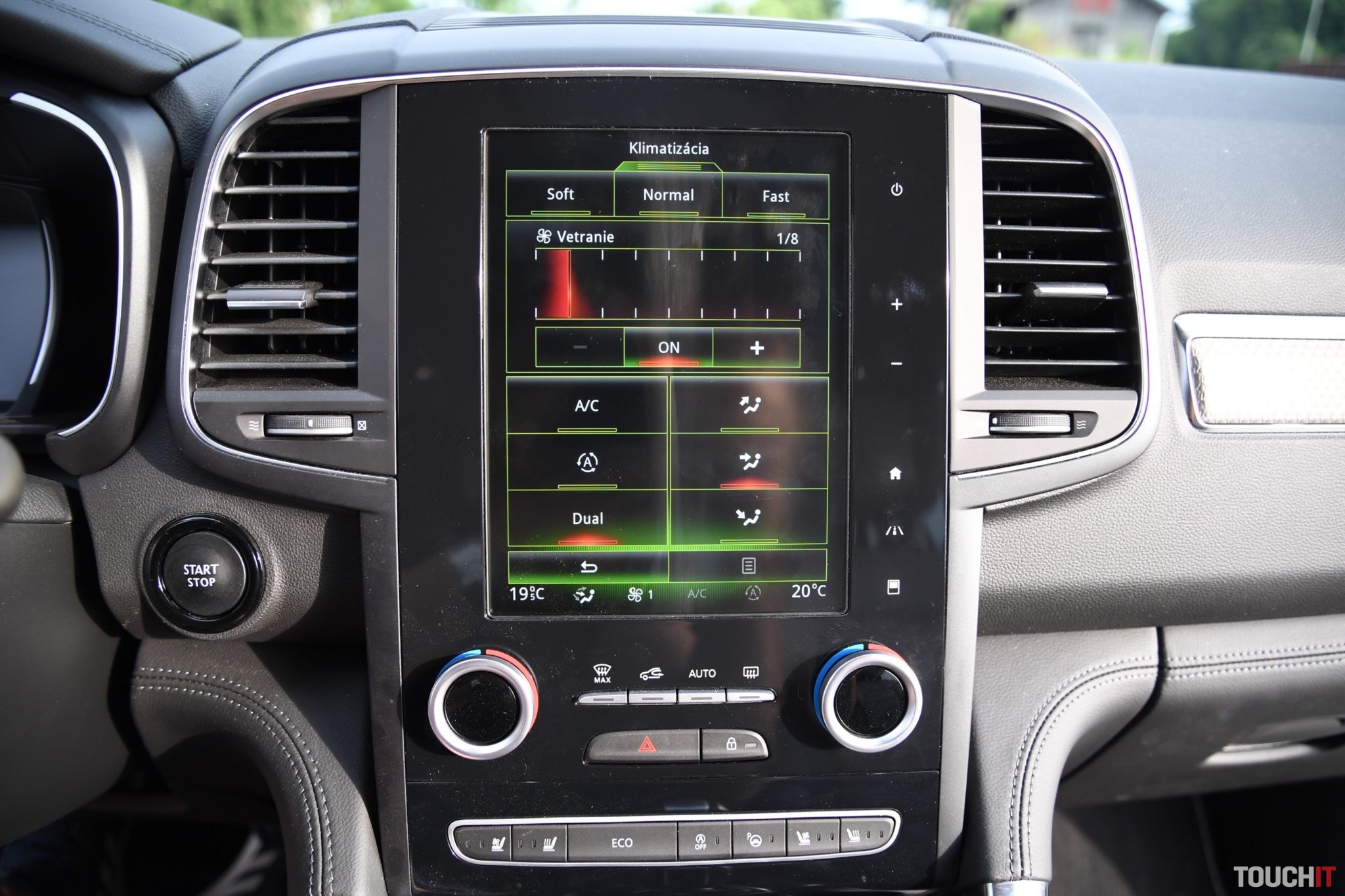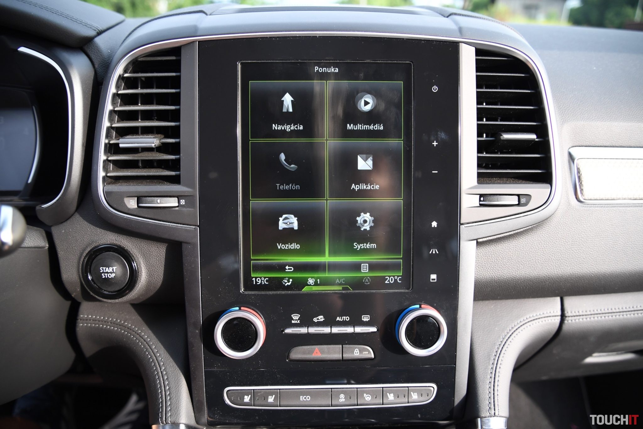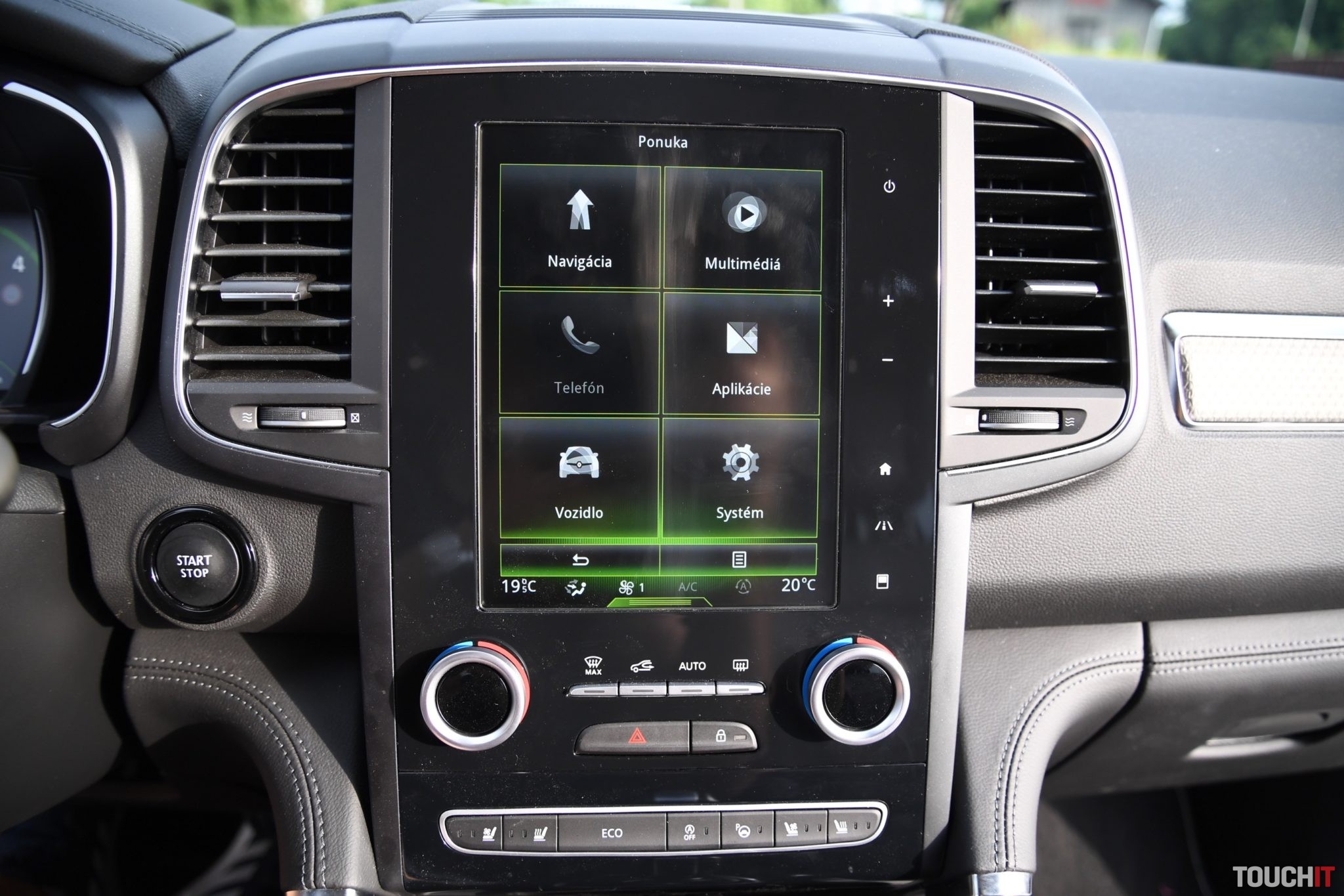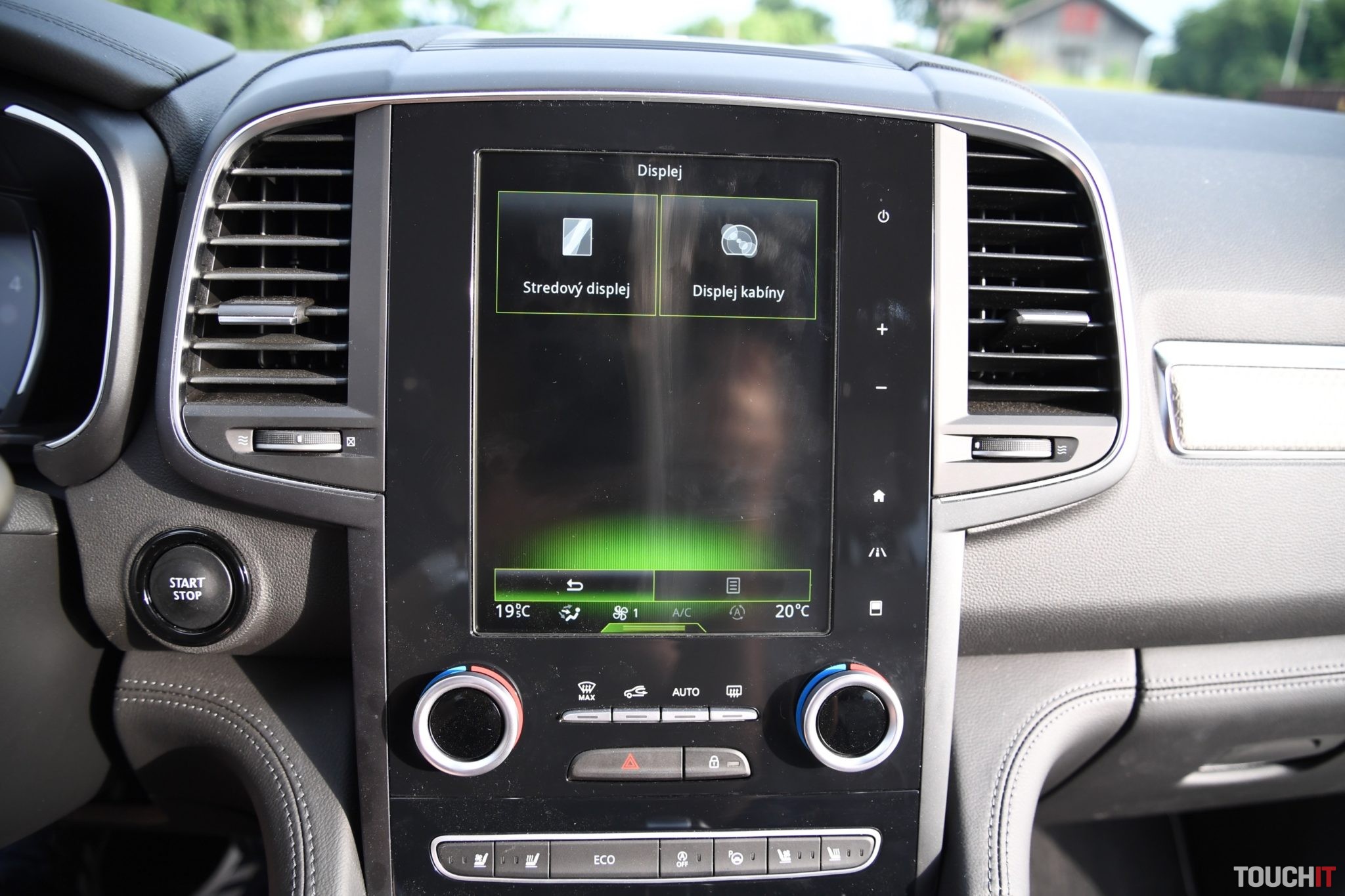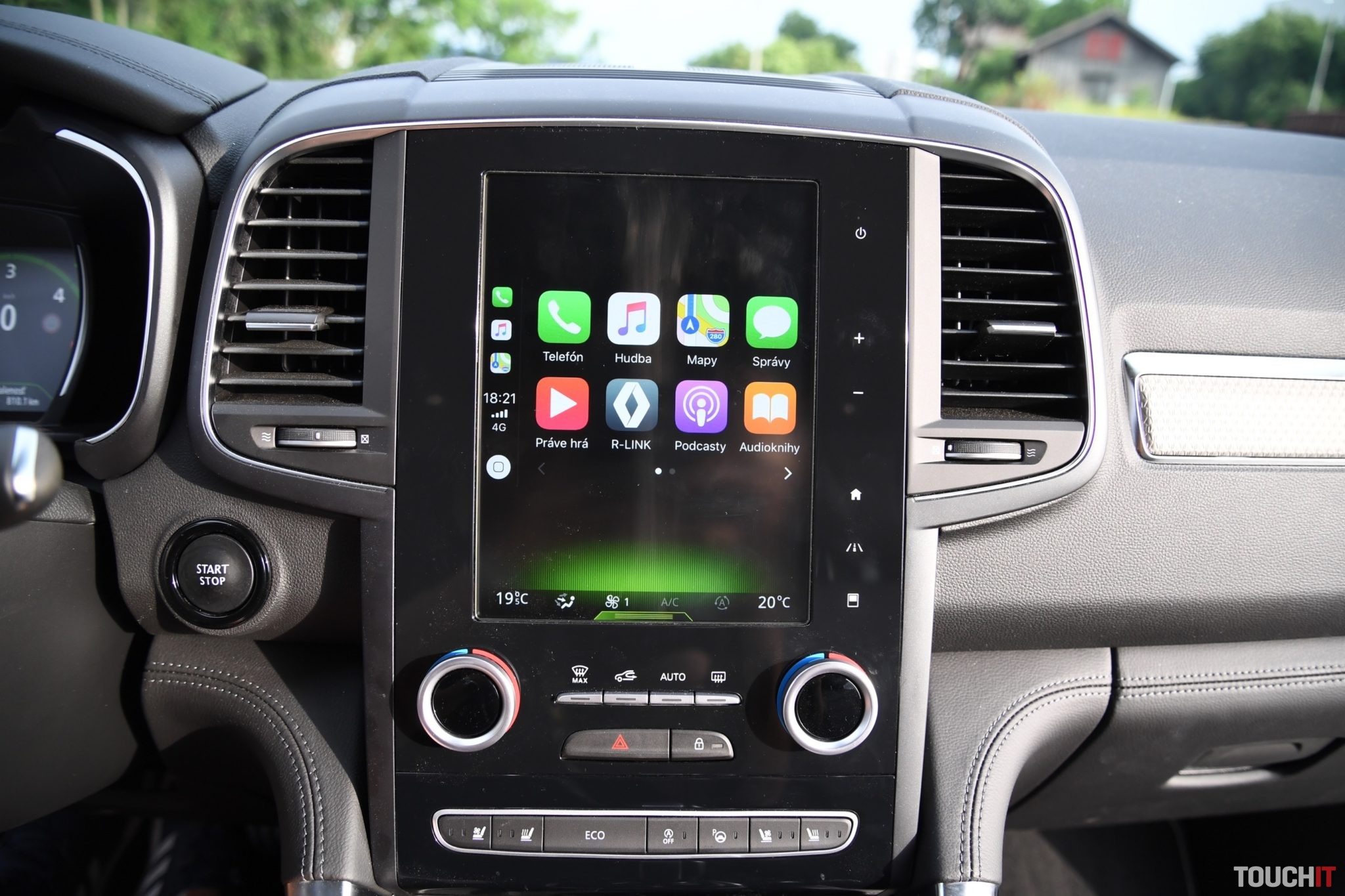 Základom celého systému je vertikálne uložený, 8,7“, dotykový LCD displej s dotykovými tlačidlami po jeho pravej strane. Umiestnený je v strede palubnej dosky a nijako nebráni výhľadu z vozidla. Nevkusne pôsobia iba veľké a nijak nevyužité rámiky okolo displeja. Pred šoférom je digitálny prístrojový panel (7“), na ktorom sa zobrazujú všetky elementárne informácie o stave a prevádzke vozidla. Prístrojový panel vie meniť aj grafiku – po aktivácii režimu ECO alebo po aktivácii režimu SPORT, resp. aktiváciou manuálneho radenia. Po bokoch displeja sú analógové ukazovatele stavu paliva a teploty chladiacej kvapaliny. Veľký displej v strede palubnej dosky disponuje inovovaným systémom R-Link 2, ktorý pracuje celkom dobre. Prijal by som však rýchlejšiu odozvu systému.
