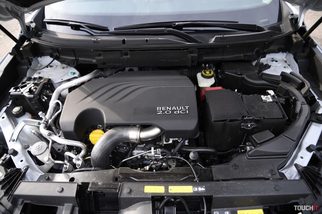 Výhoda Koleosu spočíva v pohone všetkých 4 kolies, ktorý funguje výborne. Očakávania boli menšie, ale výsledok príjemne potešil. Už pravidelnou disciplínou je kríženie náprav, kde sa Koleosu darilo veľmi dobre. Pohon všetkých kolies v automatickom režime prerozdeľoval krútiaci moment na tie kolesá, ktoré to skutočne potrebovali a na vrchol som sa dostal bez väčšej námahy. V bežnom, resp. ľahšom teréne neváha a plynulo prechádza všetky prekážky. Ak príde na rad ťažší terén, zapadnutie a pod., tak určite príde vhod možnosť zvoliť namiesto automatického režimu 4-kolky stály pohon všetkých kolies (4WD Lock), ktorý si poradí aj s o niečo ťažším terénom. Samozrejme, v rámci možností. A keď vyjdete na bežné cesty, tak je možné prepnúť iba na pohon prednej nápravy, čo dopomôže k lepšej spotrebe. Režim pohonu sa prepína tlačidlom na ľavej strane, pod volantom. Takáto možnosť je v danej kategórii skôr vzácnosťou a za to si Renault zaslúži pochvalu! Podvozok je ladený do komfortu, filtrovanie nerovností je dostatočné a do kabíny sa výrazný hluk a buchot neprenáša. Komfortne ladený podvozok a výšku auta je cítiť najmä pri ostrejšom prechádzaní zákrut. Náklony karosérie nie sú príjemné a celé to nejak kolíše. Lepšie povedané, viac ako som očakával. Počas ostrejšieho prechádzania zákrut, ktoré nemajú ideálny povrch, ako väčšina ciest na Slovensku, som občas zaznamenal aj citeľné odskakovanie prednej nápravy. Zavesenie prednej nápravy je typu MacPherson s trojuholníkovým spodným ramenom. Zadná náprava je viacprvková.