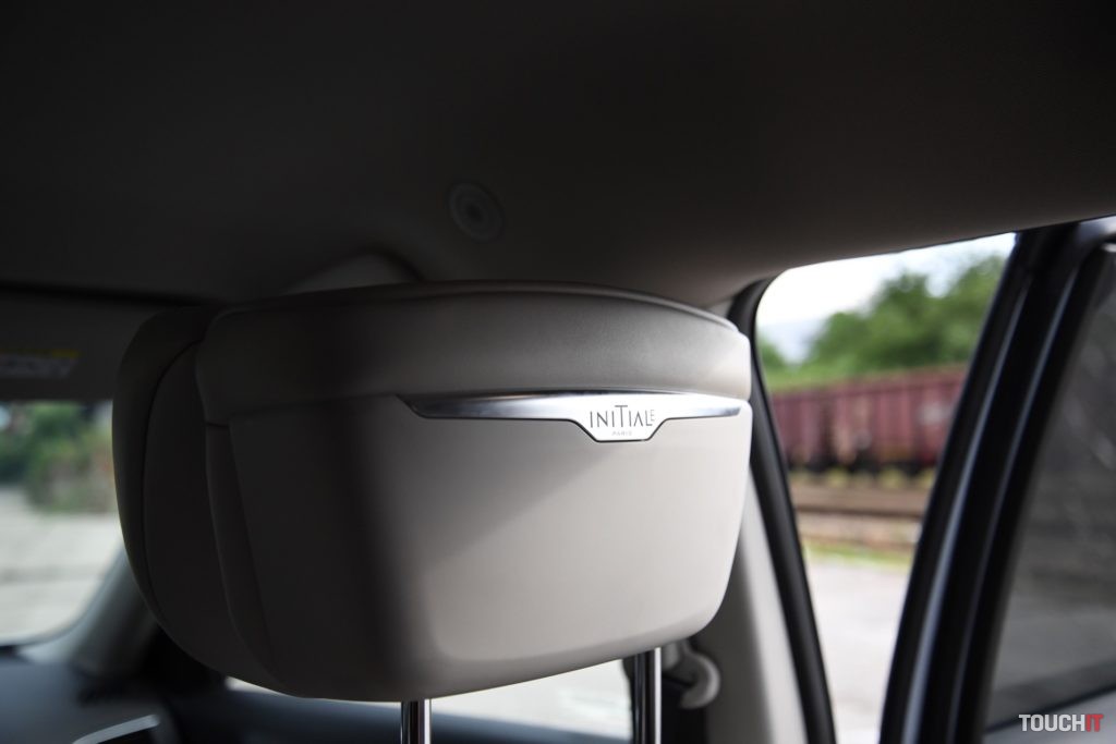 Počas testu som ocenil viacero odkladacích priestorov, ale v takto veľkom a rodinnom aute mi chýbala veľká klimatizovaná priehradka, ako to má napr. Peugeot 5008 (Recenziu nájdete > TU). Tento prvok je v lete neoceniteľný! Palubovka a výplne dverí sú vyhotovené z mäkčeného plastu a občas narazíte aj na prvky čalúnené kožou. Pekným doplnkom sú okrasné lišty palubovky so vzorom „initiale“. Stredový tunel pokrýva veľká lišta v klavírnym lakom, ktorý je pekný, ale vidieť na ňom všetky nečistoty. Najhorší prvok interiéru – madlo, ktoré prepája stredový tunel s palubnou doskou. Pochopím jeho prítomnosť na strane spolujazdca, ale na strane vodiča nie. Vodič sa drží volantu, nie madla. Celý týždeň sa mi oňho tlačilo koleno a pokiaľ som nezapol tempomat, tak to bolo nepríjemné. Posed za volantom je inak príjemný a ani po dlhšej ceste nevysadnete vyslovene unavení. Sedadlo vodiča, ako aj spolujazdca, je nastaviteľné elektricky a s dobrým rozsahom. Svoju polohu som si našiel pomerne rýchlo. O komfort sa starajú aj hlavové opierky typu relax. Tie však ocení skôr spolujazdec.