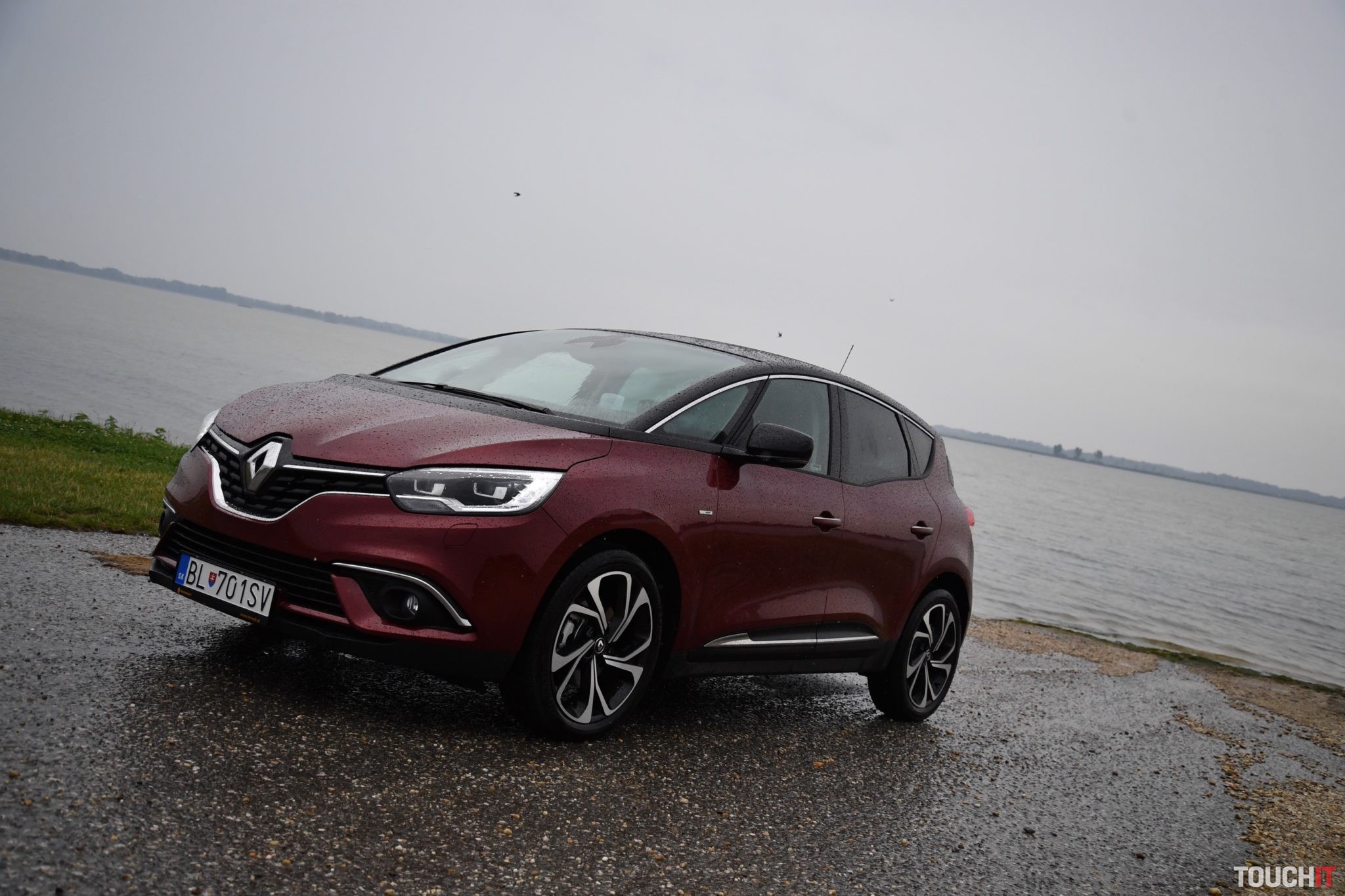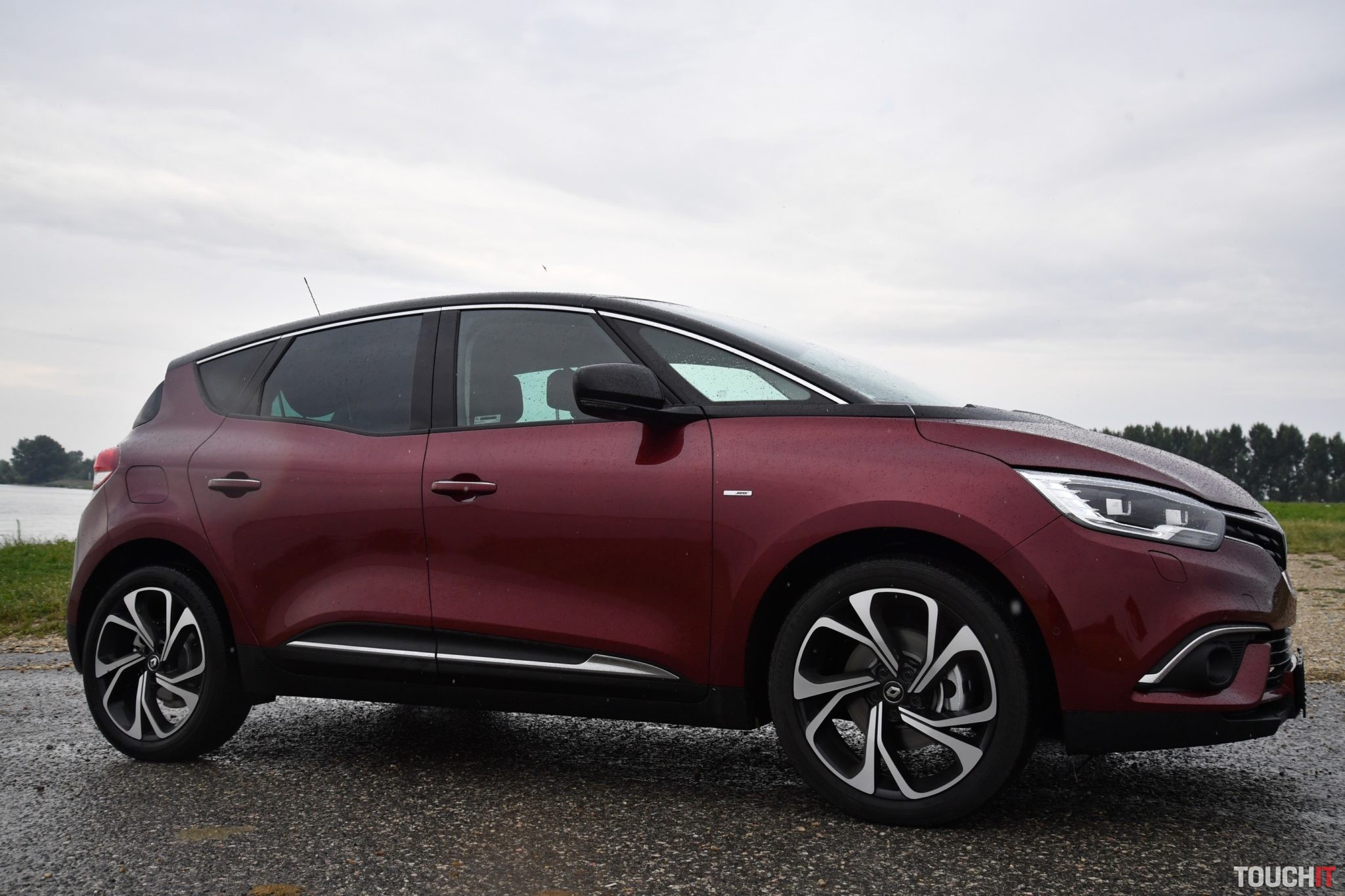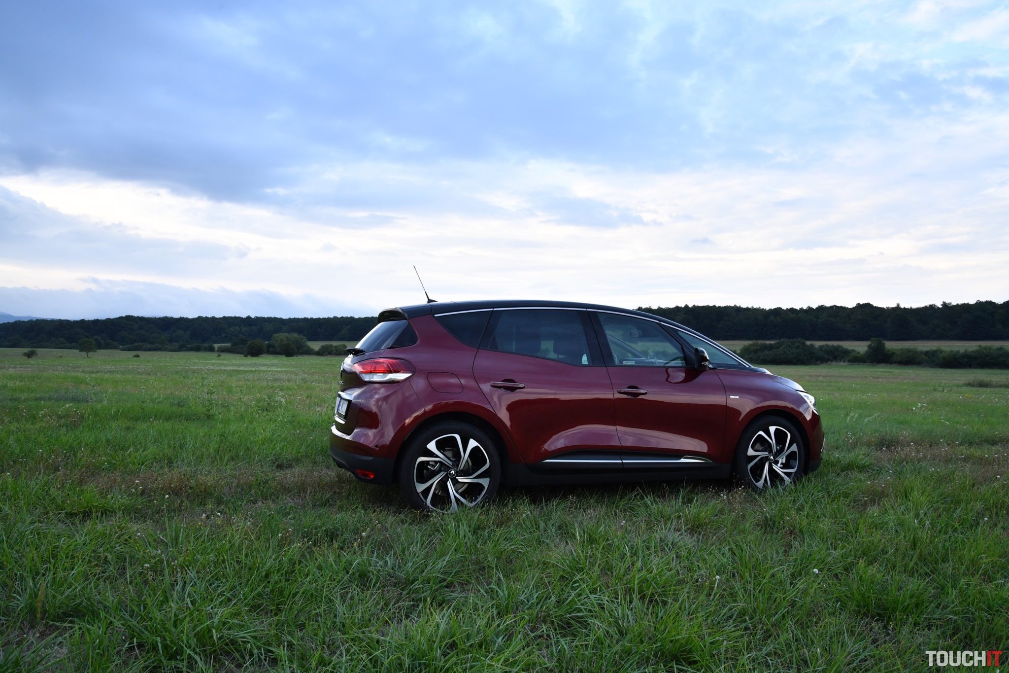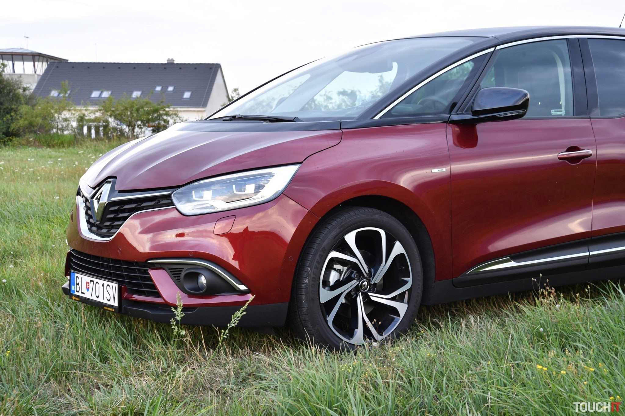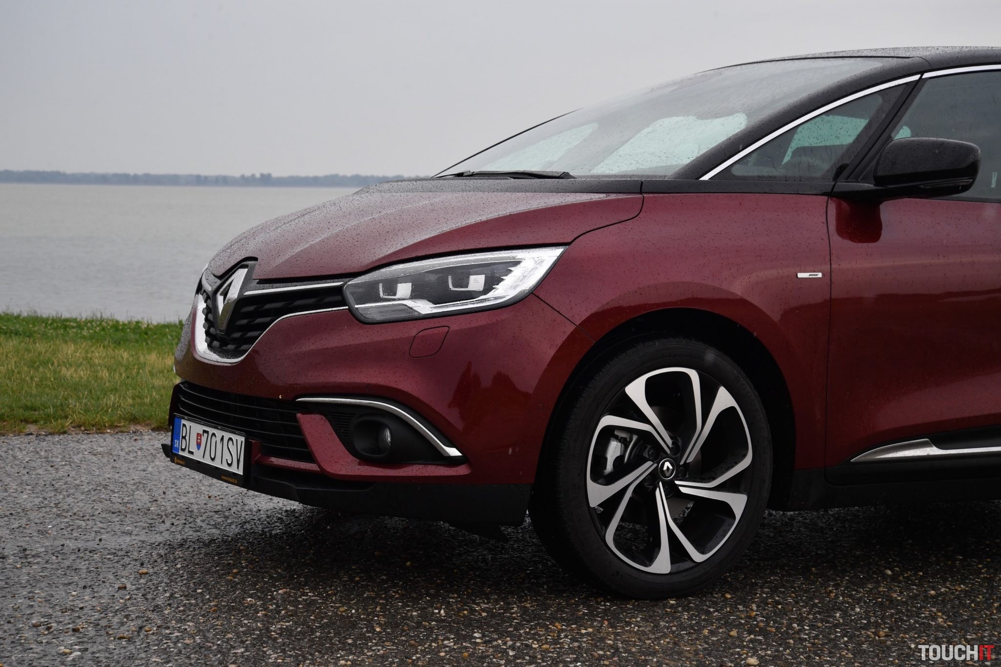 A tak iba ťažko nachádzam slová do kapitoly dizajn. Je to subjektívne, ale mne sa nový SCENIC páči. A najmä v tejto krásnej farebnej kombinácii, ktorá „hrá na city“. Farba je oficiálne červená (Carmin), no mne pripomína skôr bordovú, ktorej sekundujú čierne doplnky a v tých správnych miestach sa objavuje chróm. Dobrá práca! Krivky, prelisi a rôzne zaujímavé tvary karosérie nechýbajú, ale nie je tu nič tak výrazné, o čom by sa dalo básniť. Azda až na prednú kapotu, ktorá pôsobí svalnato. Samozrejmosťou je výrazný znak automobilky v prednej maske. Celkovo sa mi predok, ako aj bočná silueta veľmi páči. Zadná časť je fádnejšia, ale zachraňujú ju zaujímavé LED koncové svetlomety s 3D efektom. Spomenúť treba aj natiahnuté čelné sklo a dvojitý „A“ stĺpik, vďaka ktorému máte výborný výhľad z kabíny. Skleníkovú atmosféru dopĺňa veľká panoramatická strecha. Tá nie je otvárateľná, ale má elektrickú tieniacu roletu. Pre deti a romantikov je to skvelý doplnok. Mne sa to najviac páči keď prší, pričom môžem pozorovať kvapky dažďa.