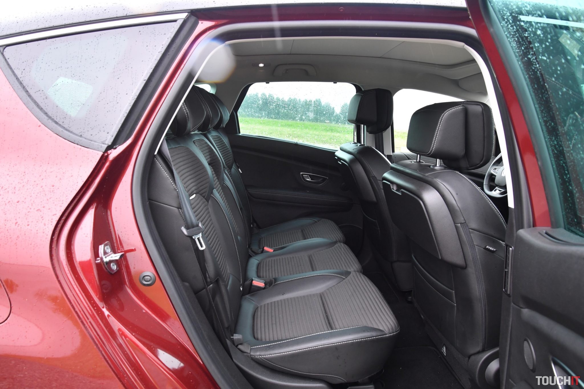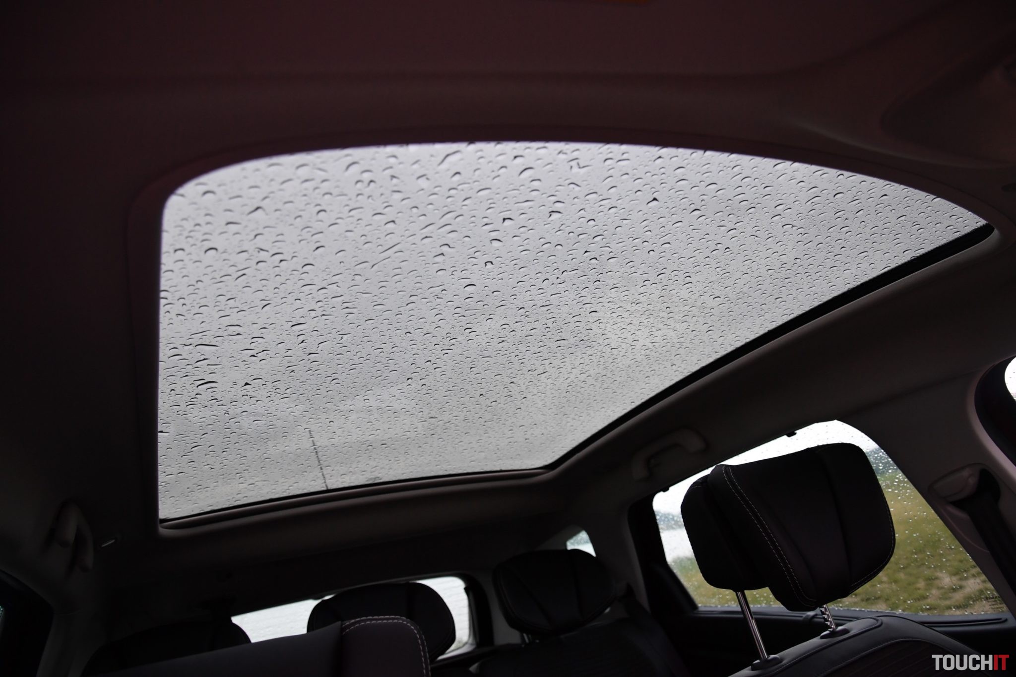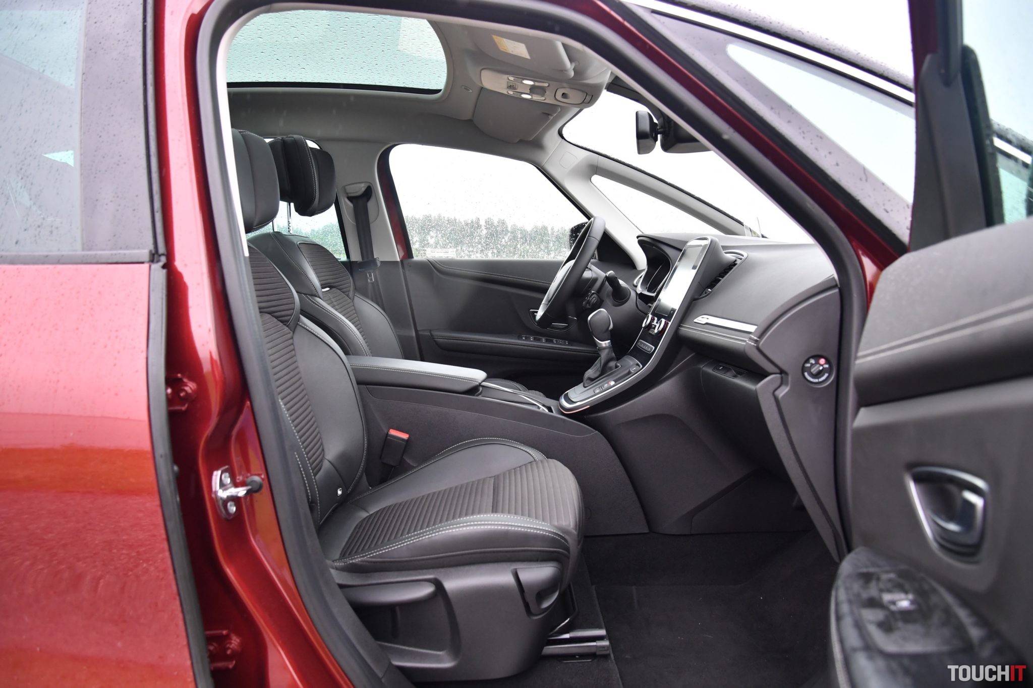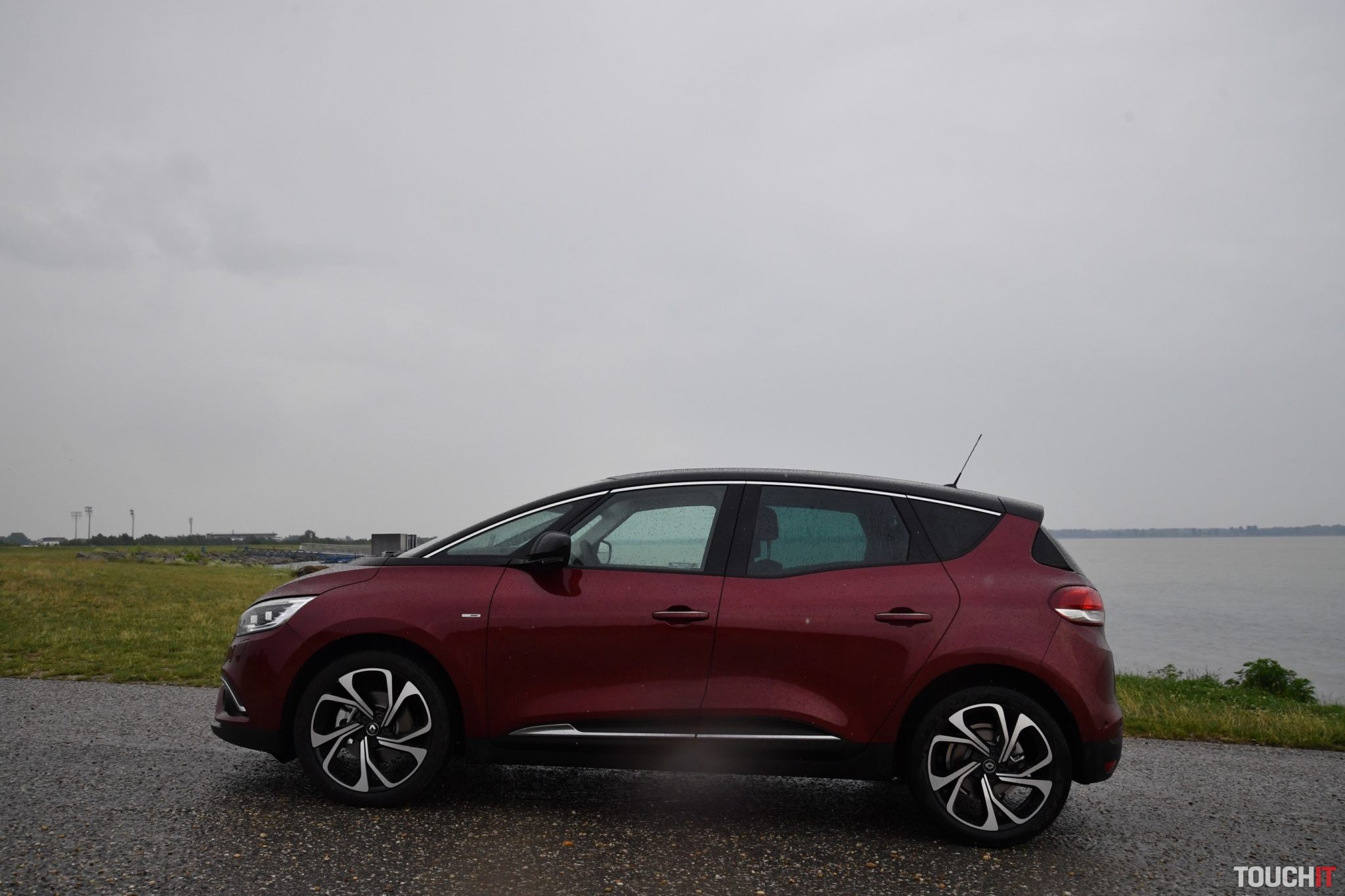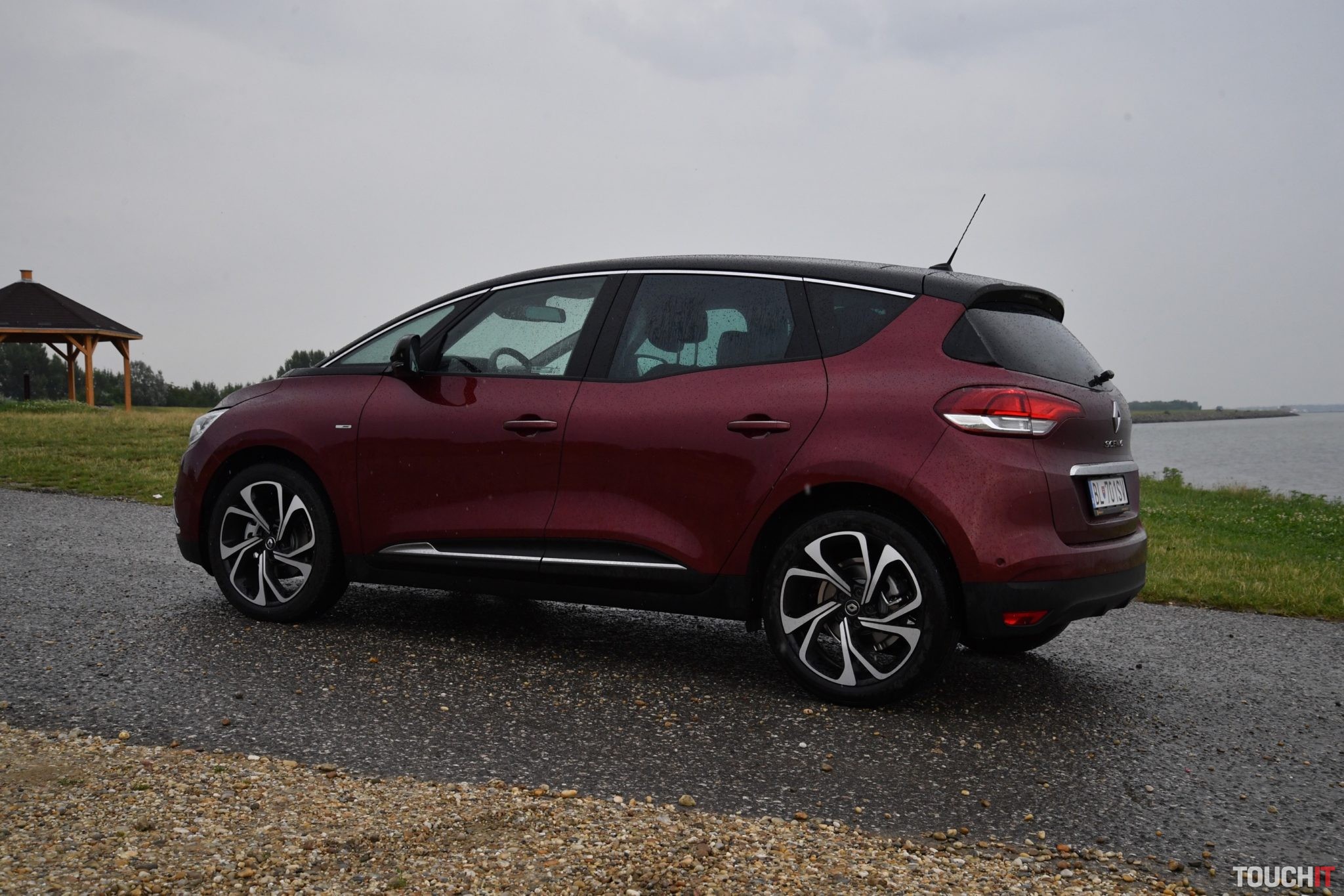 A tak iba ťažko nachádzam slová do kapitoly dizajn. Je to subjektívne, ale mne sa nový SCENIC páči. A najmä v tejto krásnej farebnej kombinácii, ktorá „hrá na city“. Farba je oficiálne červená (Carmin), no mne pripomína skôr bordovú, ktorej sekundujú čierne doplnky a v tých správnych miestach sa objavuje chróm. Dobrá práca! Krivky, prelisi a rôzne zaujímavé tvary karosérie nechýbajú, ale nie je tu nič tak výrazné, o čom by sa dalo básniť. Azda až na prednú kapotu, ktorá pôsobí svalnato. Samozrejmosťou je výrazný znak automobilky v prednej maske. Celkovo sa mi predok, ako aj bočná silueta veľmi páči. Zadná časť je fádnejšia, ale zachraňujú ju zaujímavé LED koncové svetlomety s 3D efektom. Spomenúť treba aj natiahnuté čelné sklo a dvojitý „A“ stĺpik, vďaka ktorému máte výborný výhľad z kabíny. Skleníkovú atmosféru dopĺňa veľká panoramatická strecha. Tá nie je otvárateľná, ale má elektrickú tieniacu roletu. Pre deti a romantikov je to skvelý doplnok. Mne sa to najviac páči keď prší, pričom môžem pozorovať kvapky dažďa.