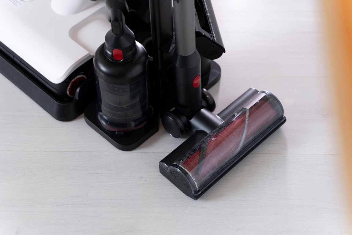 A prejdime k vysávaniu. Z mopovacej jednotky, môžete stlačením jedného tlačidla vysunúť hlavný vysávací modul a pridaním odpadovej nádoby tak máte okamžite kompaktný tyčový vysávač. Príslušenstvo k vysávaču má svoje miesto na prídavnom module k dokovacej stanici. Ak by sa vám však nevošiel tam, kam potrebujete, môžete si tento prídavný modul umiestniť zvlášť.
