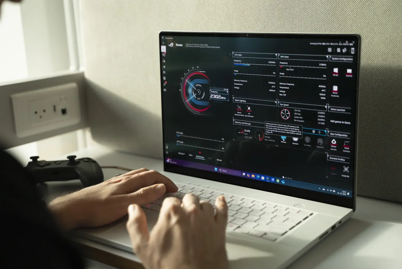 Jedným z hlavných lákadiel notebooku je grafická karta NVIDIA GeForce RTX 40. Mnou testovaná konfigurácia využívala čip GeForce RTX 4070, ktorý dosahoval frekvenciu až 1655 MHz pri TGP na úrovni 105 W. Zephyrus si vďaka tomu bez problémov poradil s hrou S.T.A.L.K.E.R. 2: Heart of Chornobyl v rozlíšení 2560 × 1600 pixelov s najvyšším nastavením vizuálov pri stabilných 60 fps.