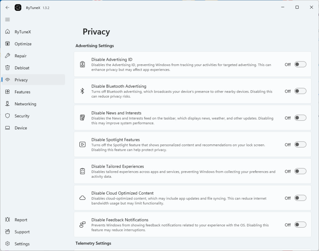 Možnosti, ktoré RyTuneX pokrýva je viac ako nájdete v okne Nastavenia v systéme. Softvér obsahuje pokročilé možnosti, ktorý by ste nemali meniť bez vedomia, o čo presne ide. Úpravami sa dá výrazne obmedziť funkcionalita systému Windows.