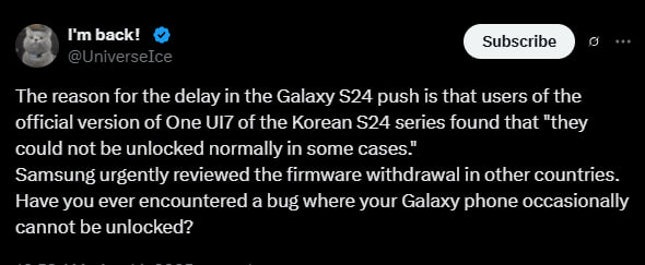 Aj napriek dlhému testovaniu, čo značne posunulo dátum vydania, Samsung sa nevyhol vážnej chybe, ktorú si testeri nevšimli. Leaker Ice Universe informoval o pozastavenej aktualizácii One UI 7, o ktorej sa diskutovalo na kórejských fórach spoločnosti Samsung.
