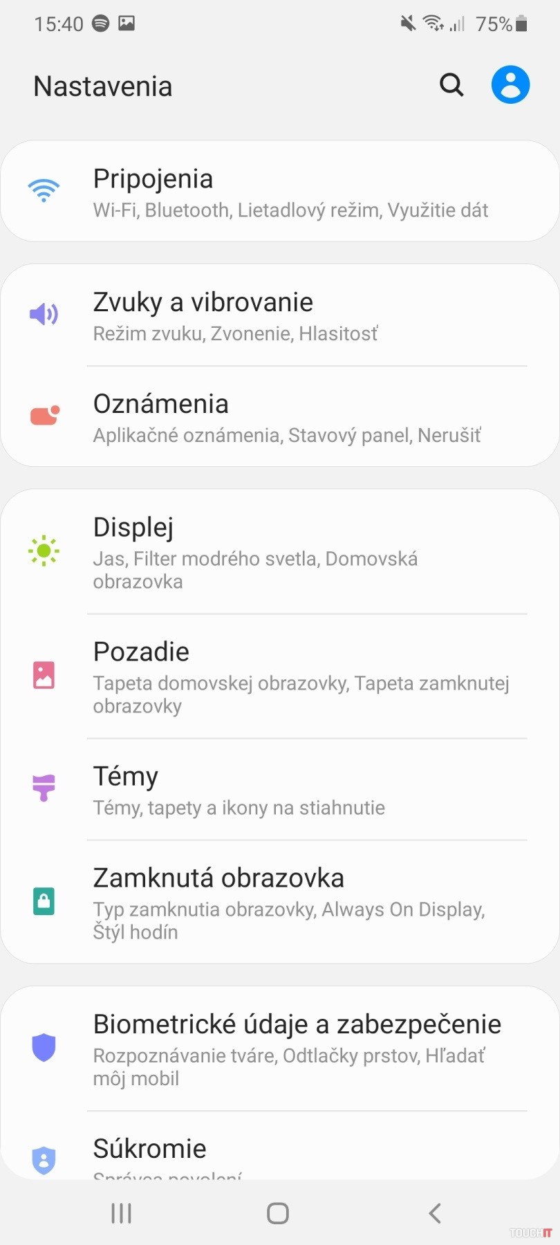 Na spodnej hrane je zároveň aj reproduktor. Zvukovo je priemerný, nijak nevybočuje zo zabehnutého štandardu mono reproduktorov. Počúvali sme na ňom hudbu aj pozerali filmy, všetko bez výraznejších výhrad. Super AMOLED displej jednoznačne chválime, tu má telefón na vrch a trochu obhajuje svoju vyššiu cenu vzhľadom na parametre. Má veľmi dobrú viditeľnosť na priamom slnku a systémovo umožňuje využívať Always-on displej. Je zaoblený po rohoch a výrez na fotoaparát je uprostred – kvapôčkový typ, výroba ho nazýva ako Infinity-U. Fotoaparáty nie sú príliš vystúpené a na rozdiel od A40 pribudol fotoaparát navyše, 5 Mpx na pomoc pri vytváraní bokeh efektu. Chválime skutočný dual SIM. Slot má teda tri priehradky na karty a pamäťová karta môže mať kapacitu až 512 GB.Rozhranie