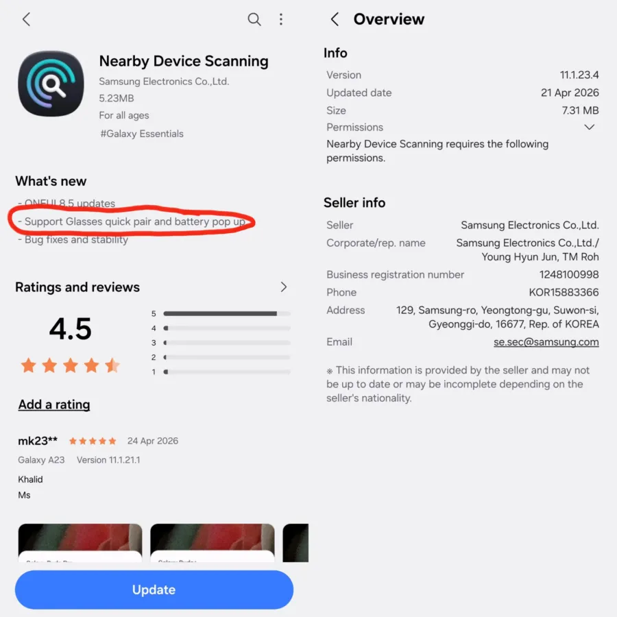 Existenciu nových okuliarov už nepriamo potvrdil aj Samsung. Ako upozornil portál SamMobile, v rámci aktualizácie aplikácie Nearby Device Scanning na verziu 11.1.23.4 pribudla podpora pre párovanie okuliarov Glasses.