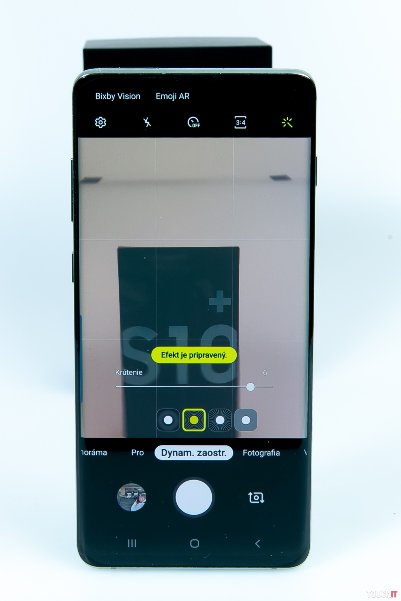 Predná kamera je teda umiestnená v diere displeja a pri S10+ spolu s RGB kamerou. Selfie kamera je zatiaľ najlepšia, aká sa do smartfónu dostala, má rozlíšenie je 10 Mpx, zorné pole 80° a clona F1.9. Pri selfie fotení si môžete mierne zmeniť šírku záberu. Aj pri selfie fotkách môžete použiť aj dynamické zaostrenie a vyzerá to dobre.