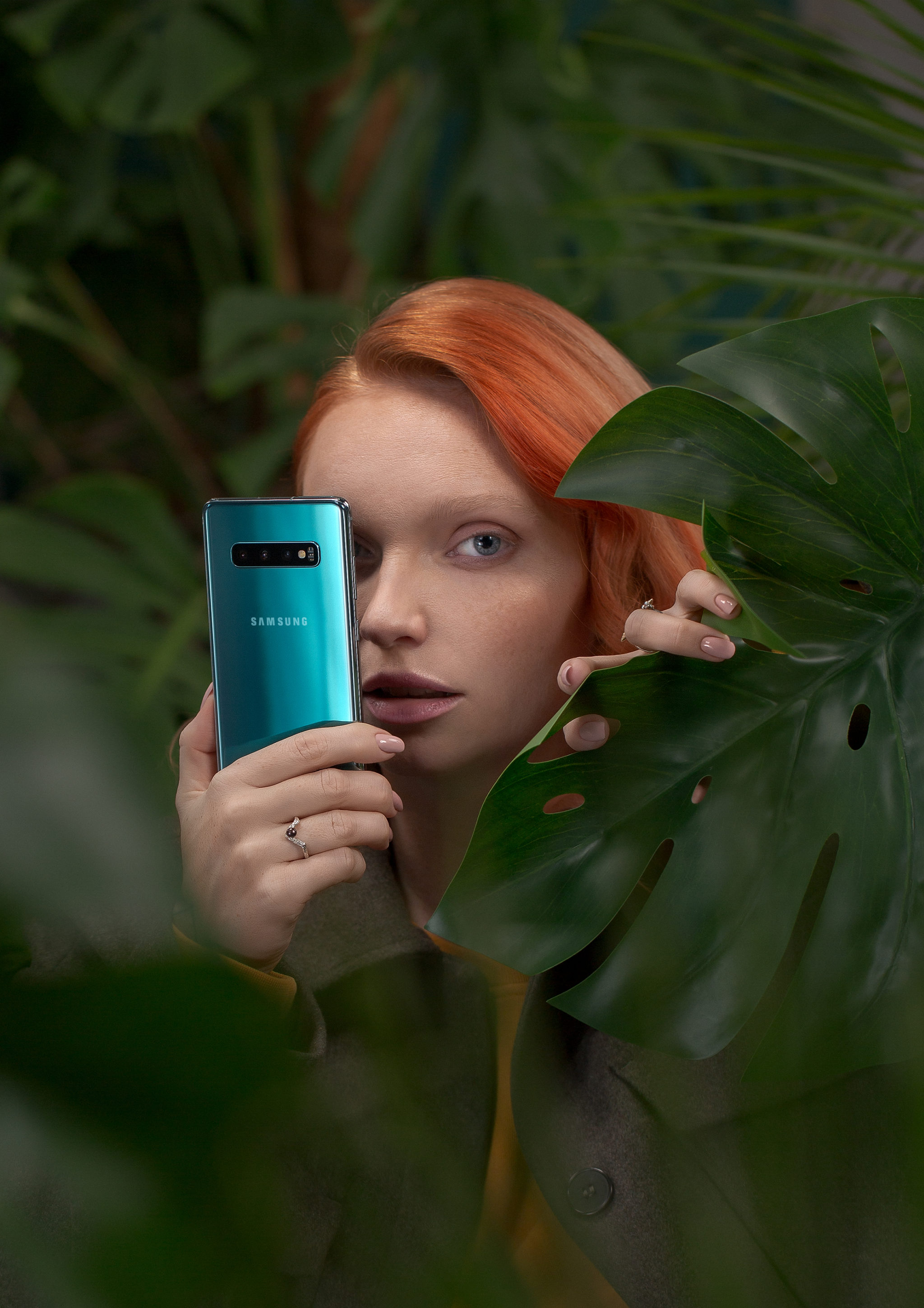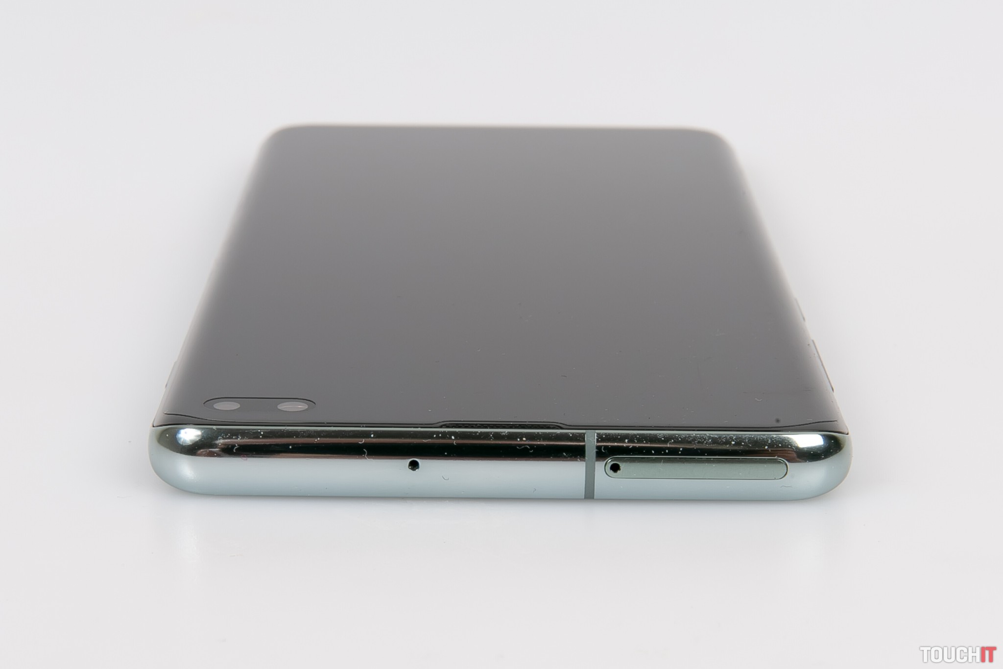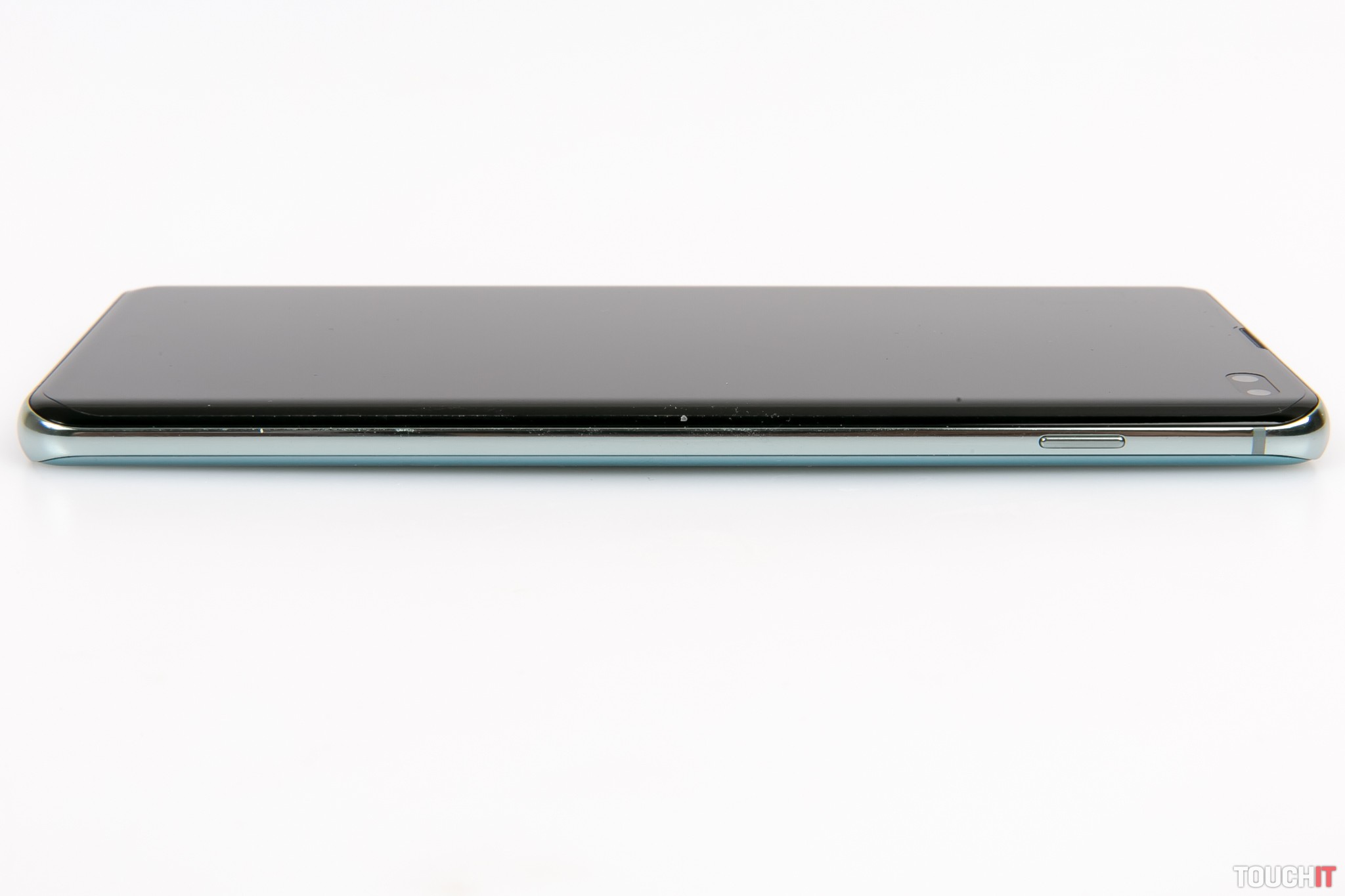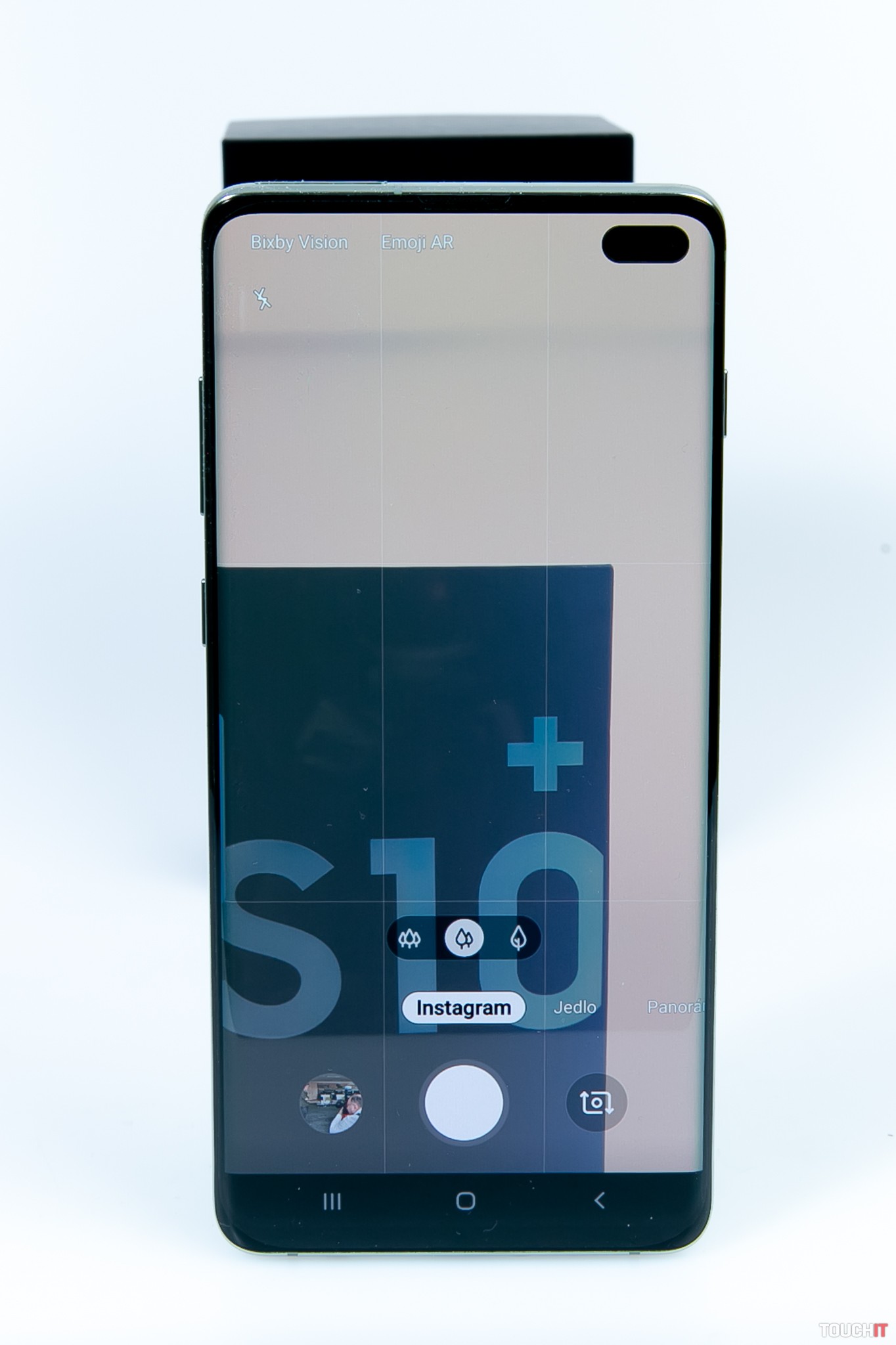 Najviac pozornosti prirodzene púta Galaxy S10+, ktorému sa budeme najviac venovať v tomto článku. Používame vyhotovenie v zelenej farbe, máme aj ochranné puzdro. S10+ má uhlopriečku displeja 6,4 palca a pomer strán 19:9. Je to úplne nový typ Dynamic AMOLED displeja aj so zníženým vyžarovaním modrého svetla a rozlíšením Quad HD+. Rozdiel v zobrazení farieb voči Galaxy S9 vidíte na prvý pohľad. Displej na S10+ je farebnejší. Obe hrany displeja sú zakrivené, v pravej hornej strane displeja je diera, kde sa nachádzajú dve kamery – v prípade S10+ jedna predná a jedna RGB na meranie vzdialenosti. Diera v tzv. Infinity-O displeji znamená, že displej zaberá prakticky celú prednú stranu celého telefónu. Vyzerá to veľmi dobre napr. pri sledovaní videa alebo fotiek.