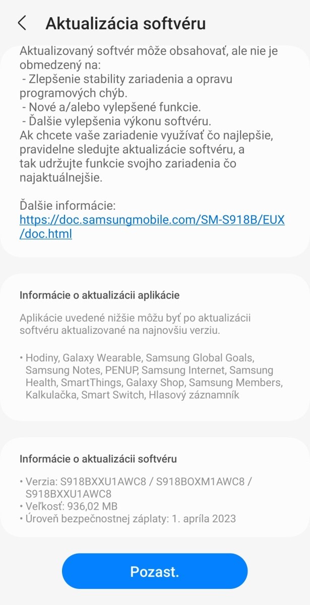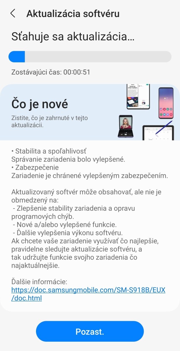 Pokiaľ ste svoj telefón série Galaxy S23 ešte neaktualizovali, alebo sa vám informácia o dostupnosti aktualizácie ešte nezobrazila, overte ju manuálne cez Nastavenia – Aktualizácia softvéru. Aktualizácia má približne 900 MB (veľkosť sa líši na základe modelu).
