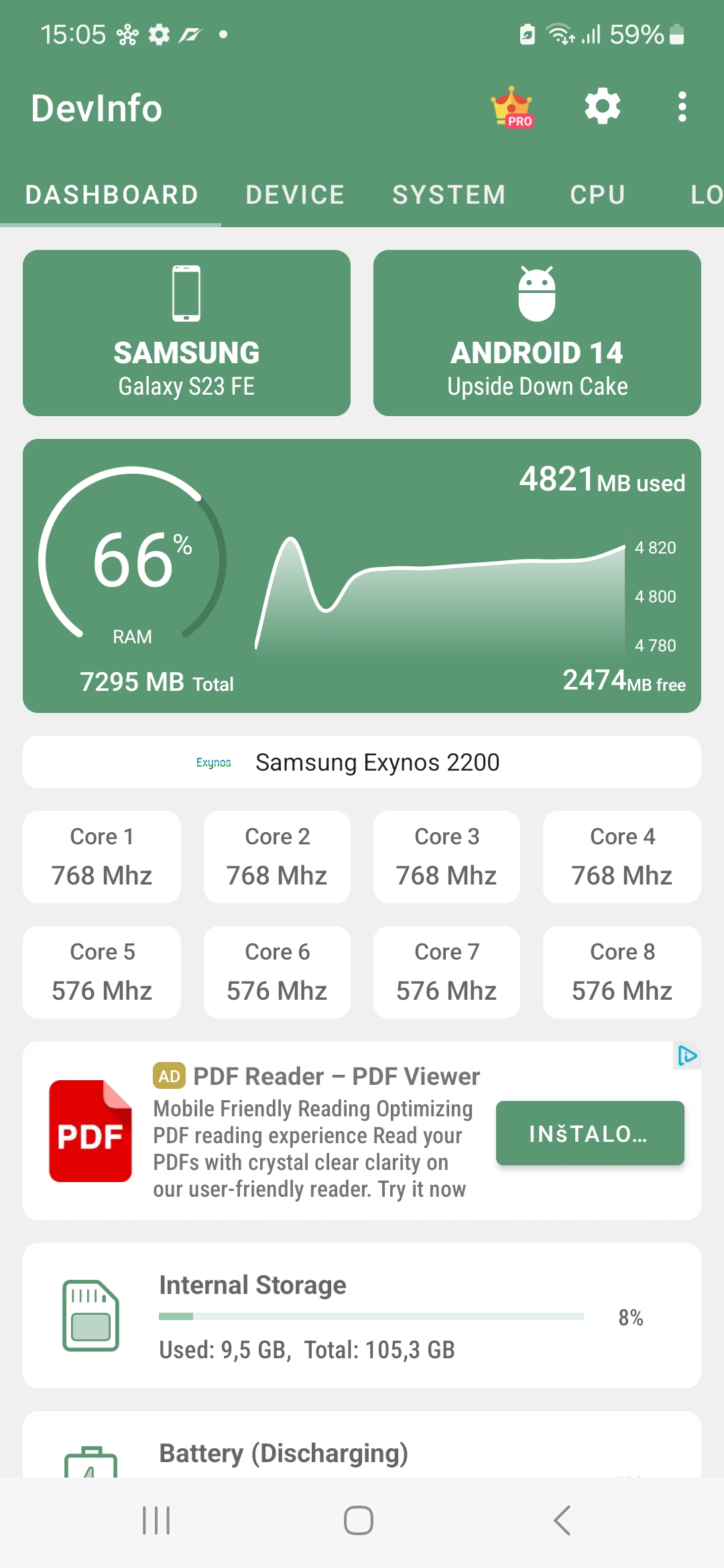 Zatiaľ teda celkom v poriadku, o niečo iné je to so samotným základom telefónu. Pre náš región je pre tento telefón použitý 8-jadrový procesor Exynos 2200. Je to 4 nm procesor, ktorý tu však už nejaký čas je, výkonom sa blíži k procesoru Snadragon 8 Gen 1. Ten sa vo vlajkových lodiach premiérovo používal tak pred dvoma rokmi. Výkon procesora je ale vyšší ako je tu u modelu Galaxy A54 a na plynulý pohyb v prostredí operačného systému a nadstavby bez problémov postačuje. Pamäť RAM mala v našom prípade kapacitu 8 GB a pamäť pre používateľa bola 128 GB. Je to pre dnešnú dobu bežný štandard.