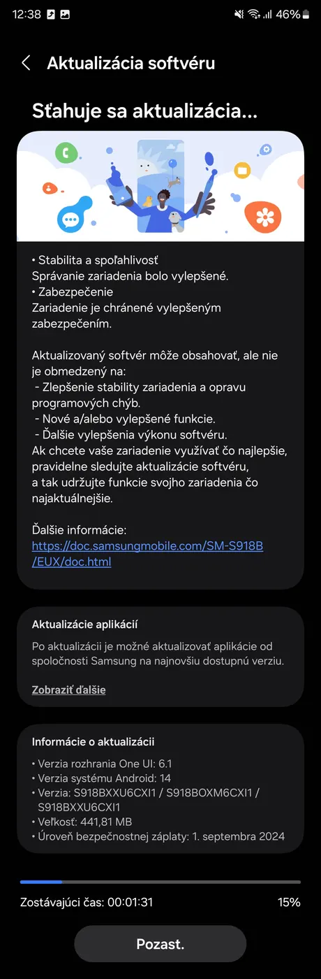 Dnes (8.10.) sme zaznamenali novú aktualizáciu pre Galaxy S23 Ultra, ktorá mala 373,02 MB. Prirodzene sme očakávali, že s príchodom novej bezpečnostnej záplaty bude opravený aj problém s fotoaparátmi. Naše očakávania mierne pokazila samotná veľkosť aktualizácie, ktorá nebola oveľa väčšia ako štandardná bezpečnostná záplata. Naše tušenie sa neskôr potvrdilo, pretože aktualizácia síce obsahovala (takmer) novú záplatu k 1. septembru 2024, avšak chyba fotoaparátov bola stále prítomná.