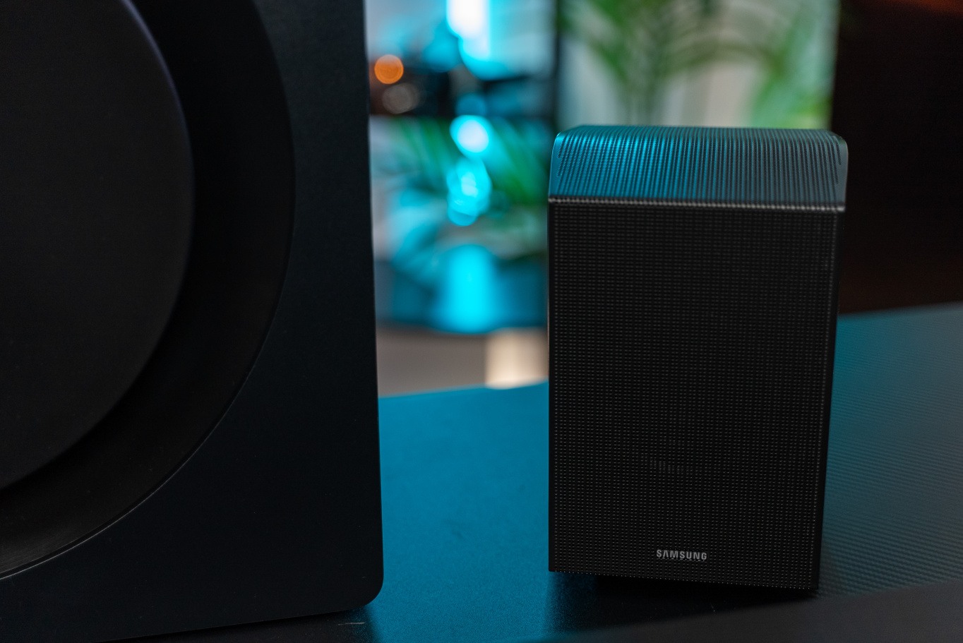 Súčasťou dodávky je aj diaľkové ovládanie, ktoré má niekoľko funkcií navyše voči tomu, čo viete ovládať s bežným DO od televízora, ak si prepojíte soundbar cez ARC port HDMI portom. Soundbar podporuje formát Dolby Atmos, čo ďalej prispieva k priestorovému šíreniu zvuku. Ten ďalej posilníte pomocou technológie Q-symphony, čo je systém, keď prepojíte do súzvuku reproduktory v soundbare s reproduktormi v televízore – samozrejme Samsung televízore.