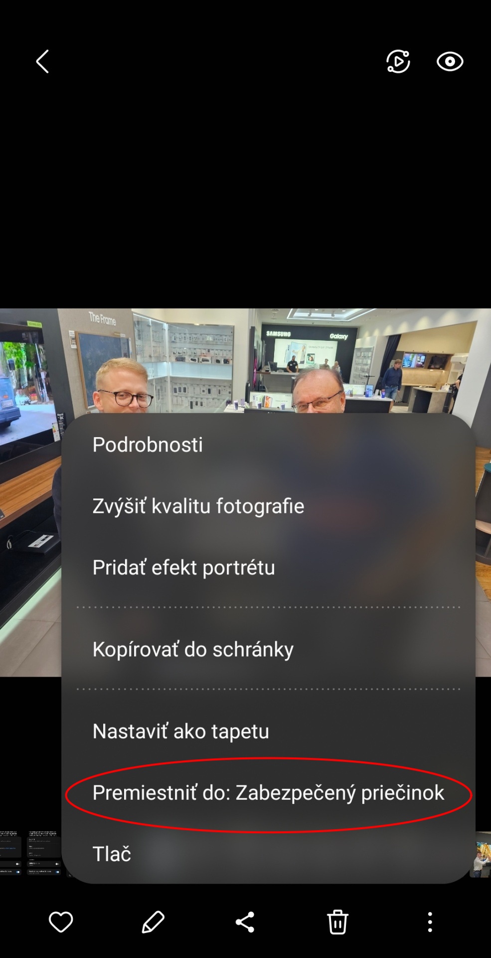 Tým je celé nastavenie hotové, Zabezpečený priečinok môžete začať využívať. Ako sa to robí? Je to jednoduché a ukážeme to v prípade fotografie. V bežnej galérii si otvoríte fotografiu, ktorá je pre vás cenná a nechcete, aby ju videl niekto, komu napr. na chvíľu požičiate váš telefón. To sa napr. v prípade rodiny, ale aj pri prezentácii fotiek pri skupinovej prezentácii celkom často stáva. Vedľa fotografie je položka s troma bodkami a keď na ňu kliknete, zobrazí sa ďalšia ponuka. Využijeme položku Premiestniť do: Zabezpečený priečinok.