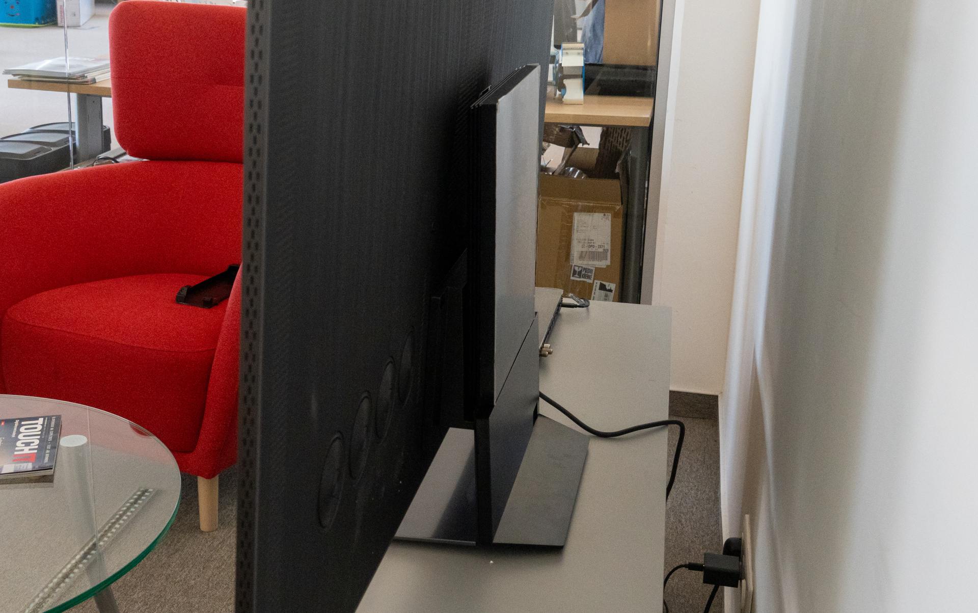 Televízor tak pôsobí ako elegantný sklenený panel vznášajúci sa v priestore.