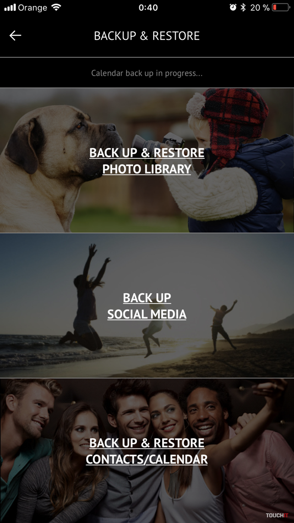 Zálohovanie/obnovenie – táto položka má tri pod kategórie. Zálohovať môžete celú galériu, kontakty, udalosti z kalendára a dokonca aj fotografie a videá zo sociálnych sietí (Facebook, Instagram a Picasa). Galériu, kontakty a kalendár je možné zálohovať manuálne alebo automaticky, po každom pripojení iXpandu. Okrem zálohovania je tu aj možnosť obnovy dát priamo do telefónu. Automatické zálohy a obnova dát neplatí pre sociálne siete.