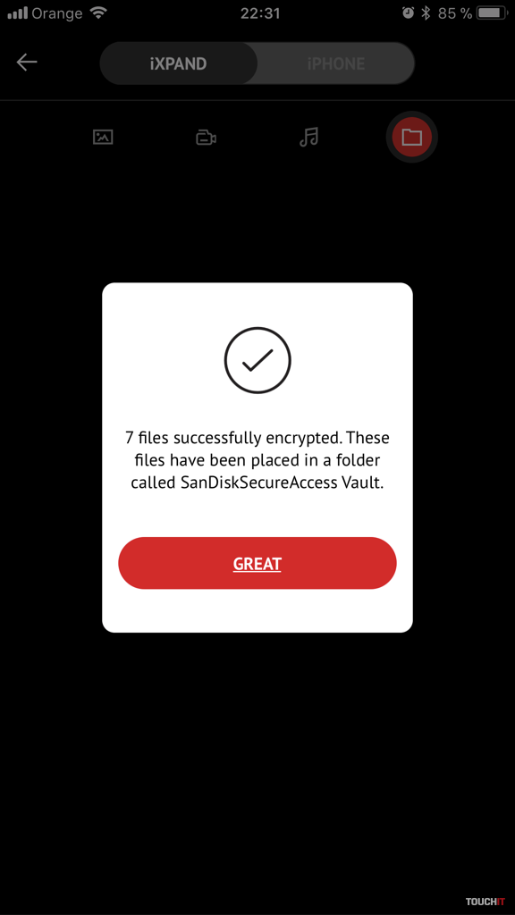 Bezpečnosť – Jednotlivé súbory alebo celé zložky môžete zašifrovať, pričom sa k nim dostanete iba po zadaní vami vytvoreného kódu alebo za pomoci touchID. Záleží na tom, ktorý spôsob zvolíte. Výhodou je, že ak iXpand pripojíte k počítaču, šifrované dáta v bežnej zložke nevidíte, sú skryté. V ponuke je aj možnosť dešifrovania súborov za pomoci programu, ktorého inštalačný balík sa nachádza na kľúči (pre macOS a Windows), toto nám však nefungovalo korektne. Nevýhodou je aj to, že šifrovanie väčších zložiek a súborov trvá dlhší čas.