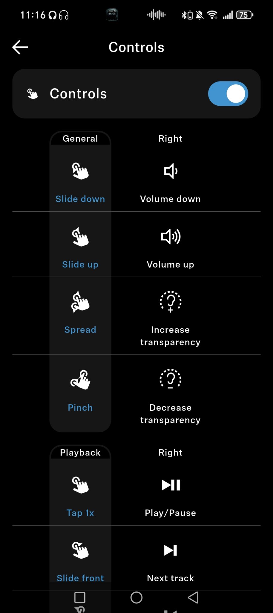 Pravá mušľa je vyhradená na ovládanie a má dotykovú plochu. Reaguje na množstvo gest – pohybom nahor pridáte hlasitosť, ťuknutím pozastavíte hudbu a pohybom dvoch prstov prepínate ANC alebo priepustnosť adaptívneho prepúšťania zvuku okolo vás. Je tu množstvo kombinácií, ktoré sa menia v závislosti od toho, či počúvate hudbu alebo telefonujete.