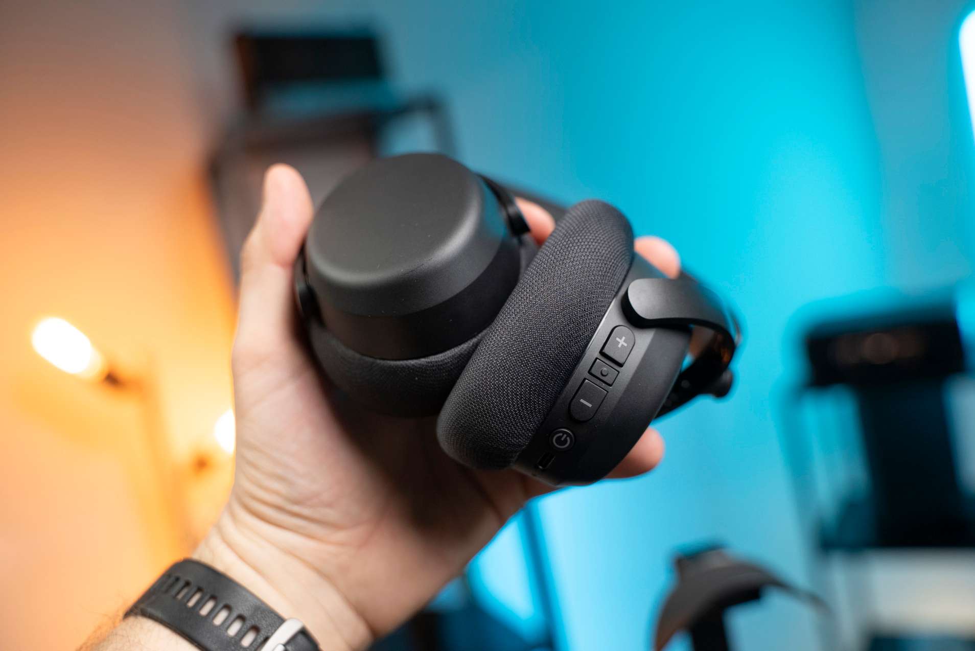 Na pravej mušli sú tlačidlá na úpravu hlasitosti, pozastavenie hudby, vypnutie a tiež USB-C na nabíjanie a kombinovaný port 3,5 mm audio jack/optický kábel (takisto všetko v balení).