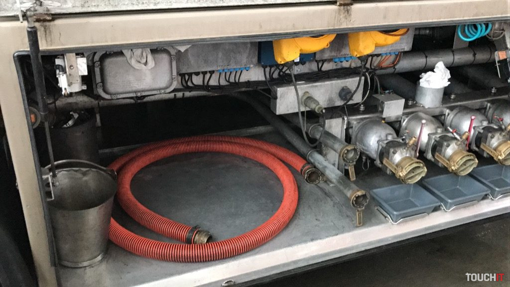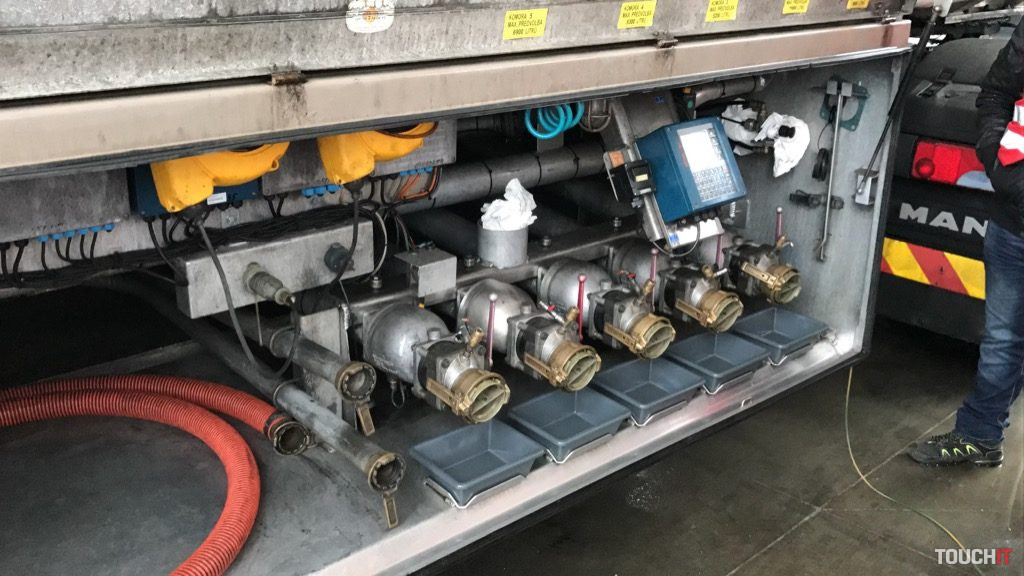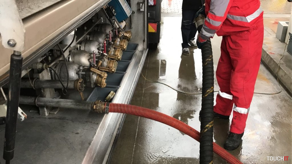 Následne prichádzajú na rad technológie, samozrejme, až po nasadení príslušných hadíc na prečerpanie paliva z cisterny do nádrží. Celý proces prečerpávania je ovládaný cez počítač, ktorý sa nachádza pri výdajných otvoroch cisterny. Počítač, resp. napojený prietokomer je natoľko presný, že prečerpané palivo je zmerané na decilitre. Pochybnosti o tom, že by šofér nevydal toľko paliva ako má, sú bezdôvodné, v dnešnej dobe tu už nejde.